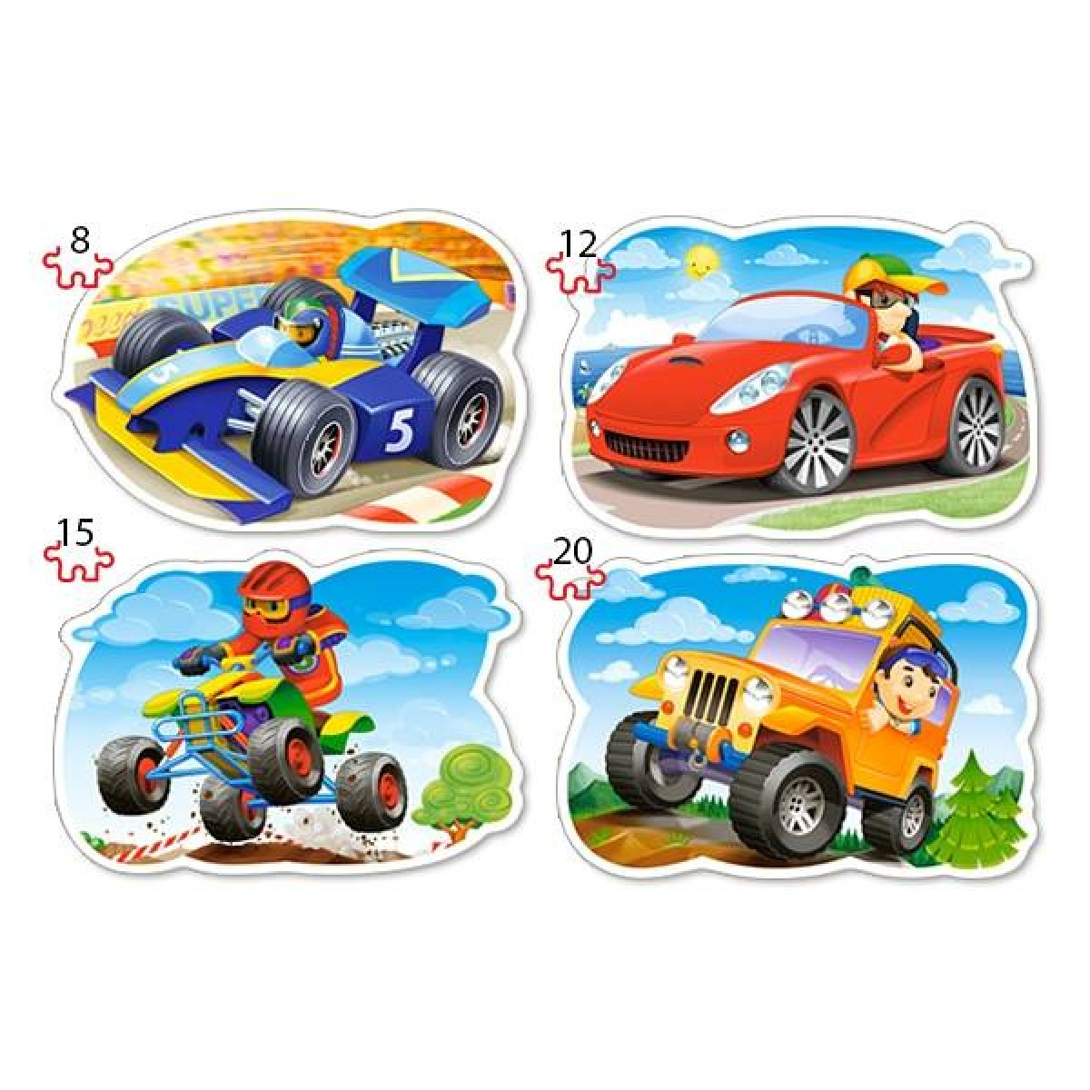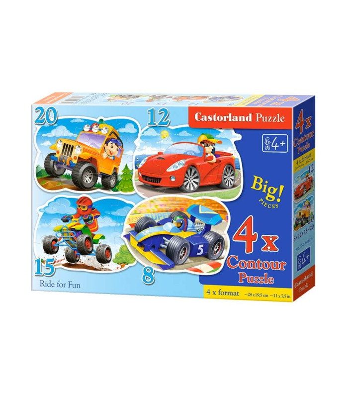 Puslemäng 4 x Kontuur 8+12+15+20 tükki on mõeldud kõige noorematele, koosnedes neljast eraldi pildist, mille raskusaste varieerub. Erksad värvid, hoolikalt valitud disain ja suured tükid teevad pusle kokkupaneku lapsele lihtsaks. Pusled kutsuvad avastama muinasjutumaailma, loomi ja sõidukeid. Need aitavad arendada seostamisoskust ja suurendada käelisi oskusi. Pärast kokkupanekut moodustub pilt mõõtmetega 28x19,5 cm. Kõrge kvaliteet ja esteetilised värvid innustavad iga last puslet kokku panema.