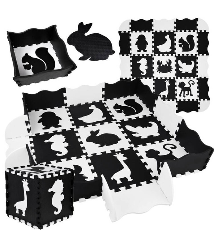Suurepärane vahtmadrats lastele, koosneb 16 pehmest puslest kontrastsetes must-valgetes toonides. Tänu oma kaasaegsele, neutraalsele värvilahendusele sobib see ideaalselt igas laste toas. Kontrastsed värvid tõmbavad väikelaste tähelepanu ja stimuleerivad nende nägemisvõime arengut.