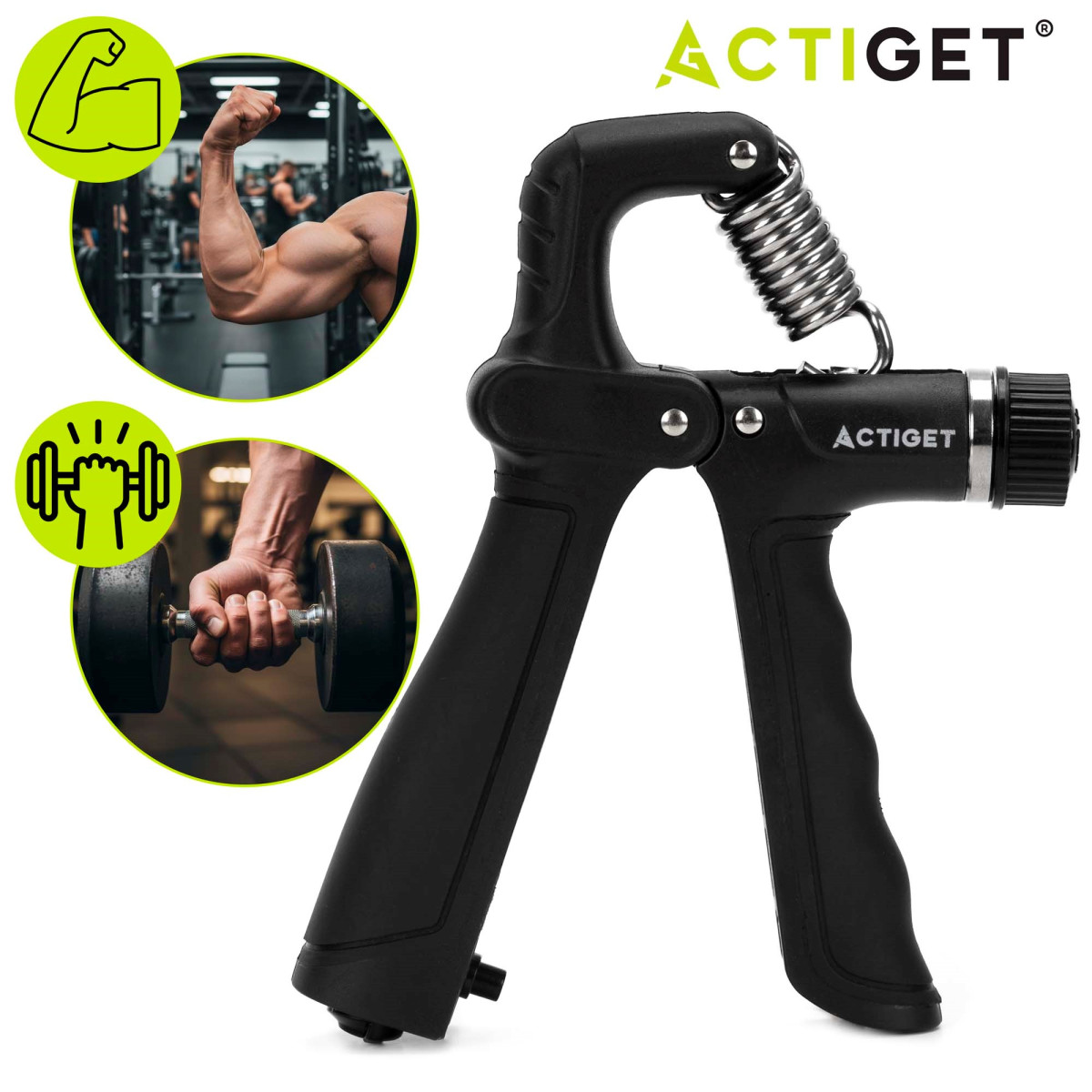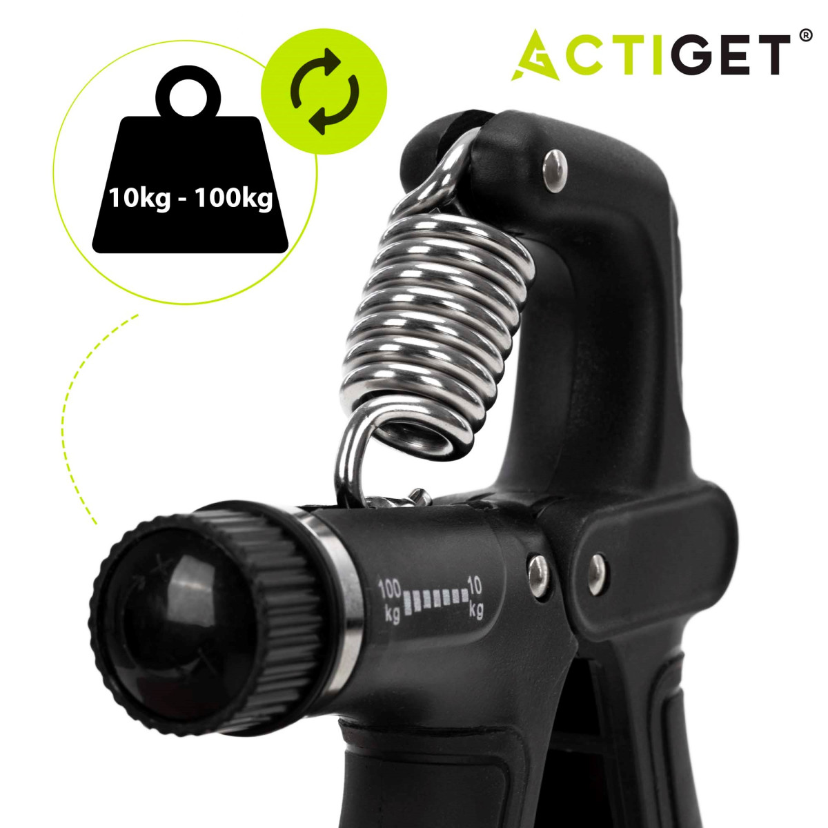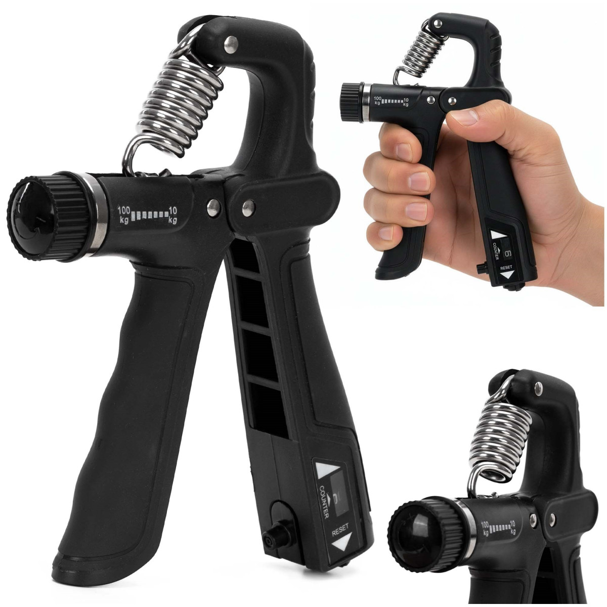 Kaubamärk: Actiget® Värv: must, hõbedane Materjal: PP, TPR, teras Vastupanu reguleerimine: 10–100 kg Libisemisvastased käepidemed Mõõtmed: Kogukõrgus: 16,5 cm Kogulaius: 11 cm Kogupaksus: 2,2 cm Käepideme pikkus: u 9 cm Käepideme läbimõõt: u 2 cm Käepidemete vahe puhkeasendis: 4 cm Vedru läbimõõt: 17 mm Lisainfo: Vastupanu reguleerimine reguleerimisnupu abil Loendur näitab pigistuste arvu – ekraaniga loendur, lähtestamine reguleerimisnupu abil Tootel on Actiget® logo