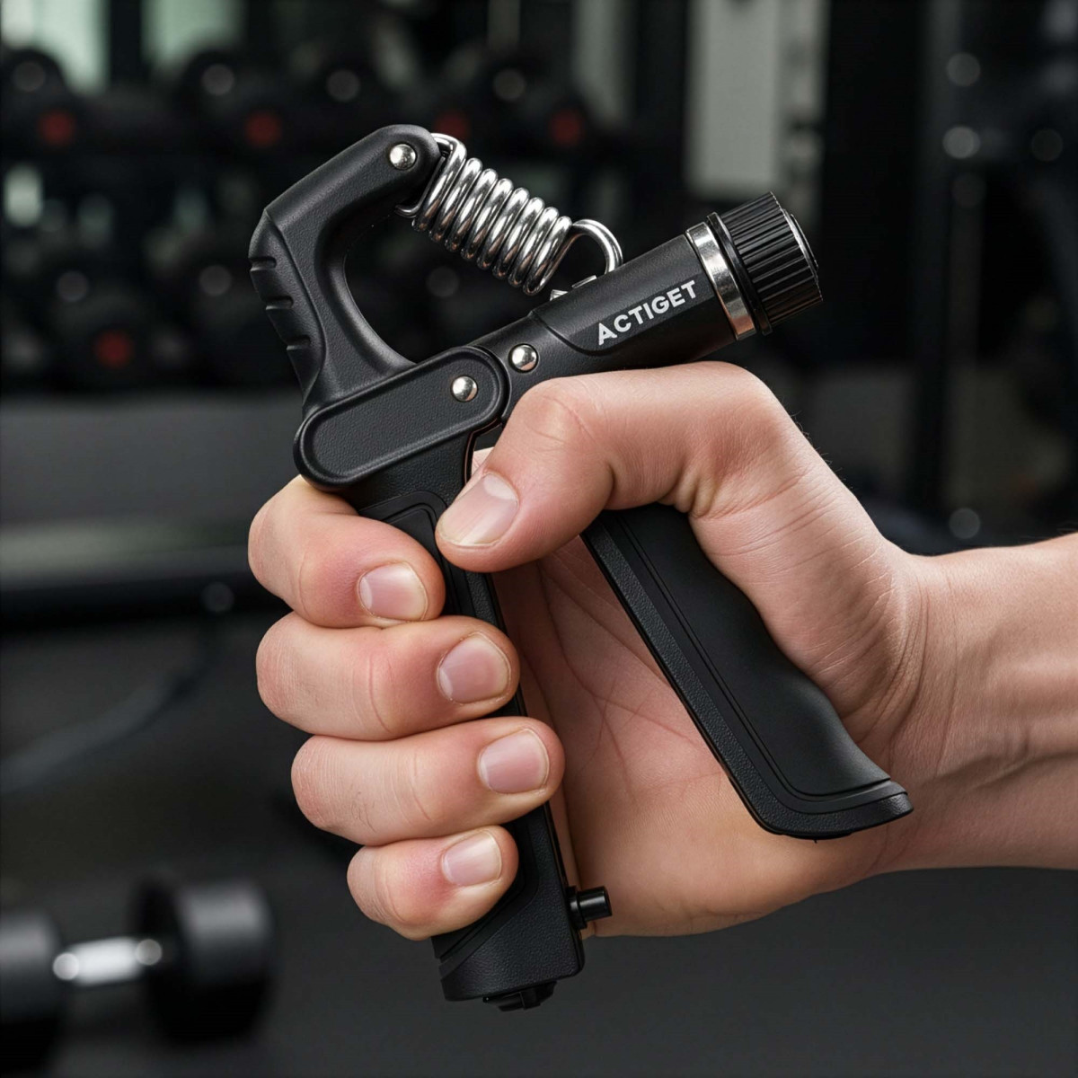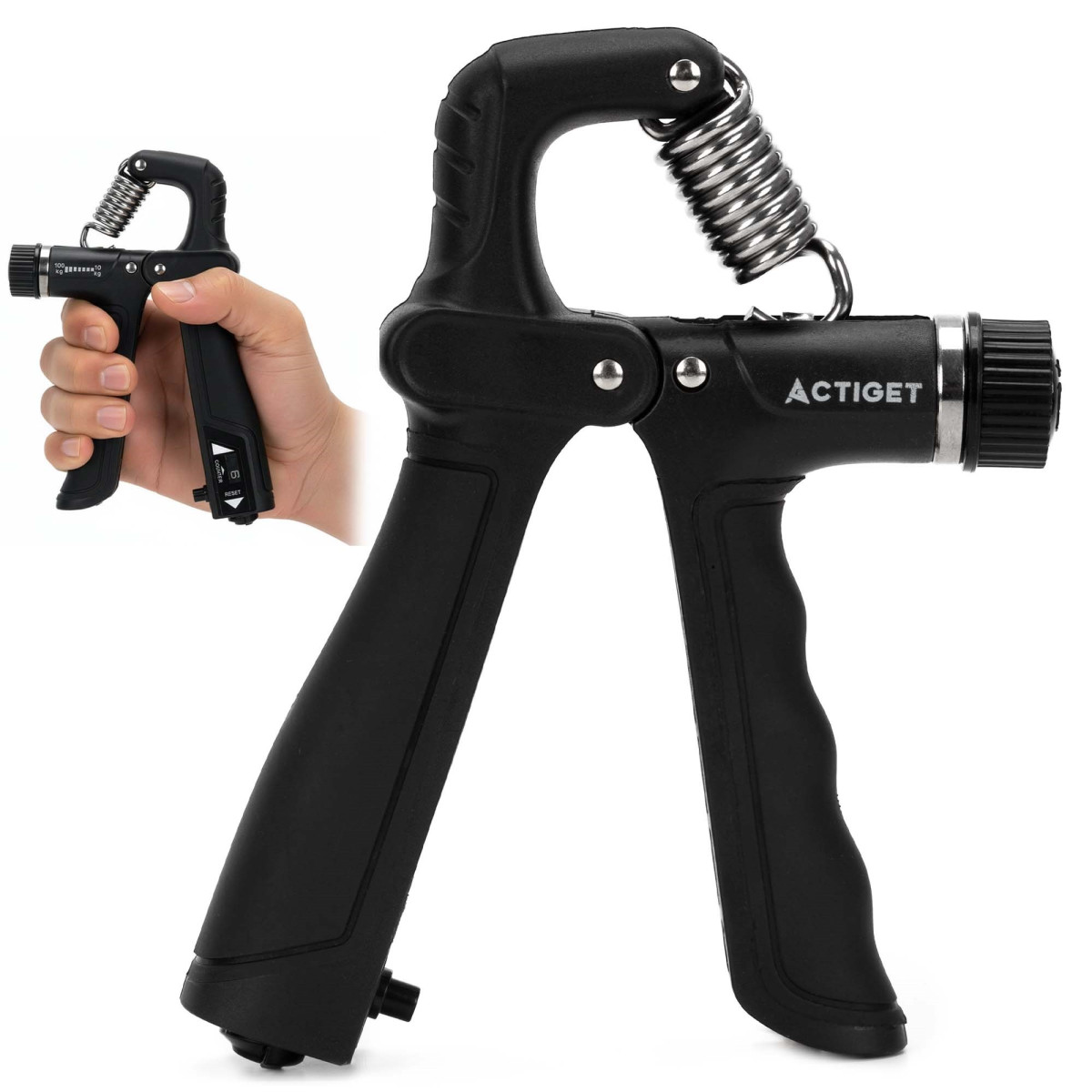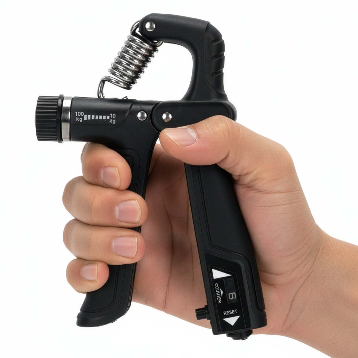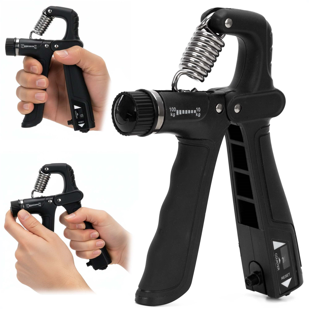 Kaubamärk: Actiget® Värv: must, hõbedane Materjal: PP, TPR, teras Vastupanu reguleerimine: 10–100 kg Libisemisvastased käepidemed Mõõtmed: Kogukõrgus: 16,5 cm Kogulaius: 11 cm Kogupaksus: 2,2 cm Käepideme pikkus: u 9 cm Käepideme läbimõõt: u 2 cm Käepidemete vahe puhkeasendis: 4 cm Vedru läbimõõt: 17 mm Lisainfo: Vastupanu reguleerimine reguleerimisnupu abil Loendur näitab pigistuste arvu – ekraaniga loendur, lähtestamine reguleerimisnupu abil Tootel on Actiget® logo