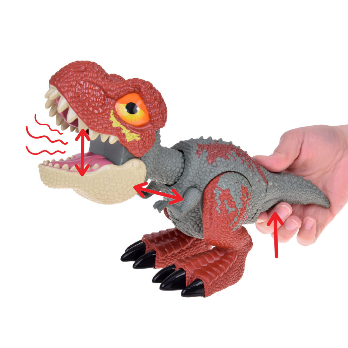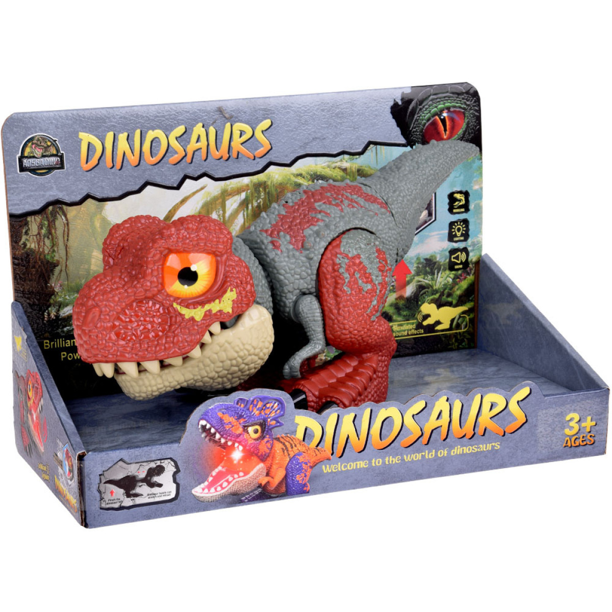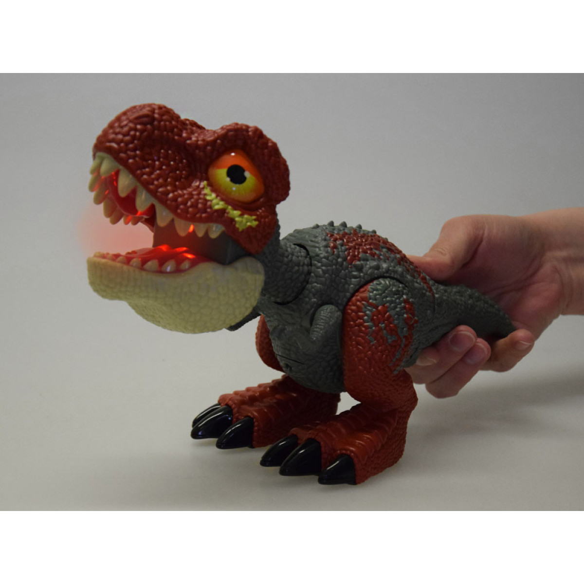 Helide ja valguse aktiveerimiseks vajutage dinosaurus saba. Seejärel tõmbub figuuri pea ettepoole ja suu avaneb, tekitades realistlikke möirgehääli, mis meenutavad dinosauruste helisid miljoneid aastaid tagasi. Samal ajal kiirgab suu seest intensiivset punast valgust, mis tugevdab "õuduse efekti" ja selle eelajaloolise eluka võimsust.