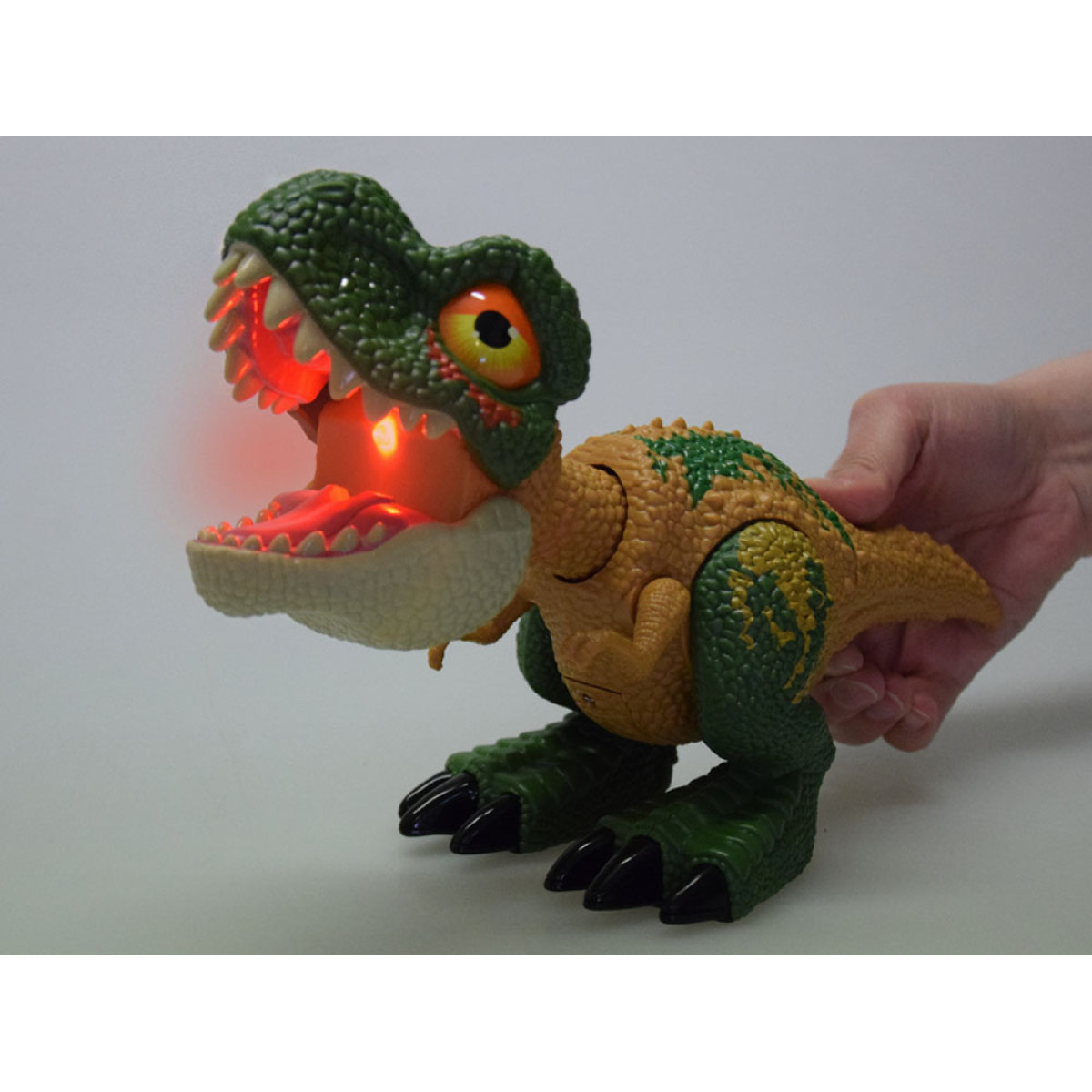 Heli ja valguse käivitamiseks piisab, kui vajutada dinosauruse sabale. Sel hetkel pea liigub ettepoole ja suu avaneb, tekitades realistlikke röginaid, meenutades helisid, mida dinosaurused võisid miljoneid aastaid tagasi teha. Samal ajal tekib suu sisemusest intensiivne punane valgus, mis tugevdab "hirmu" ja selle eelajaloolise metsalise võimsuse tunnet.