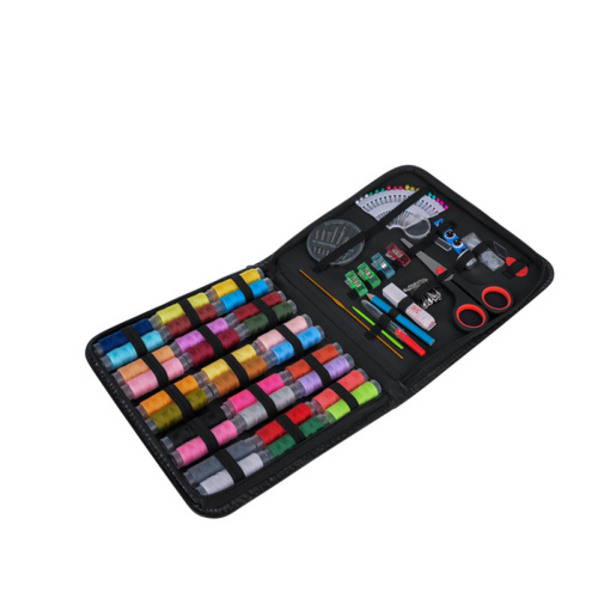 praktiline õmbluskomplekt käepärases lukuga kotis sobib ideaalselt igapäevasteks parandusteks, käsitööks ja väikesteks rõivaparandusteks. Komplektis on lai valik värvilisi niite ning vajalikud tarvikud, mis teevad õmblemise lihtsaks ja mugavaks. Kõik osad on paigutatud kinnitusribade alla, nii et need püsivad omal kohal ja on alati kiiresti leitavad.