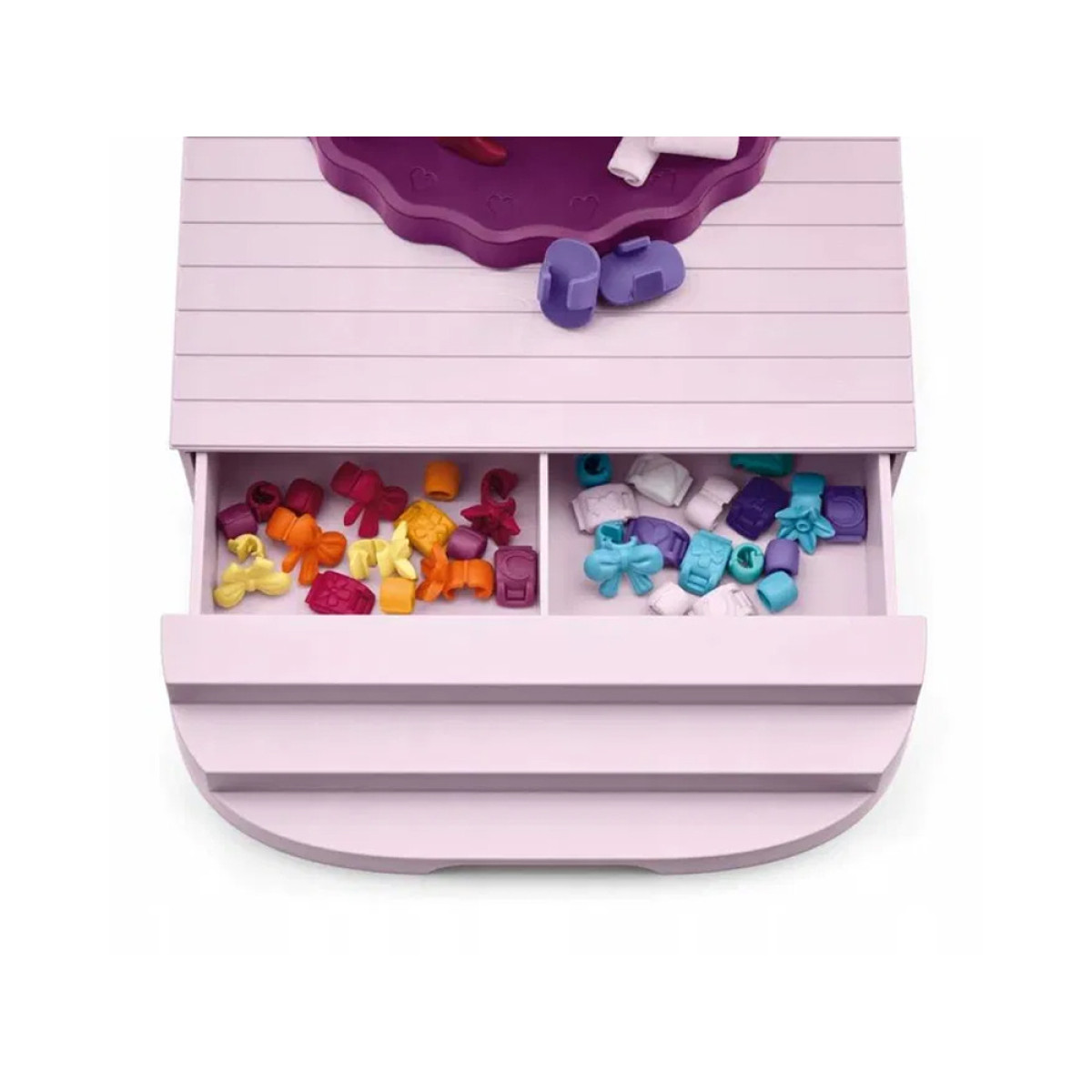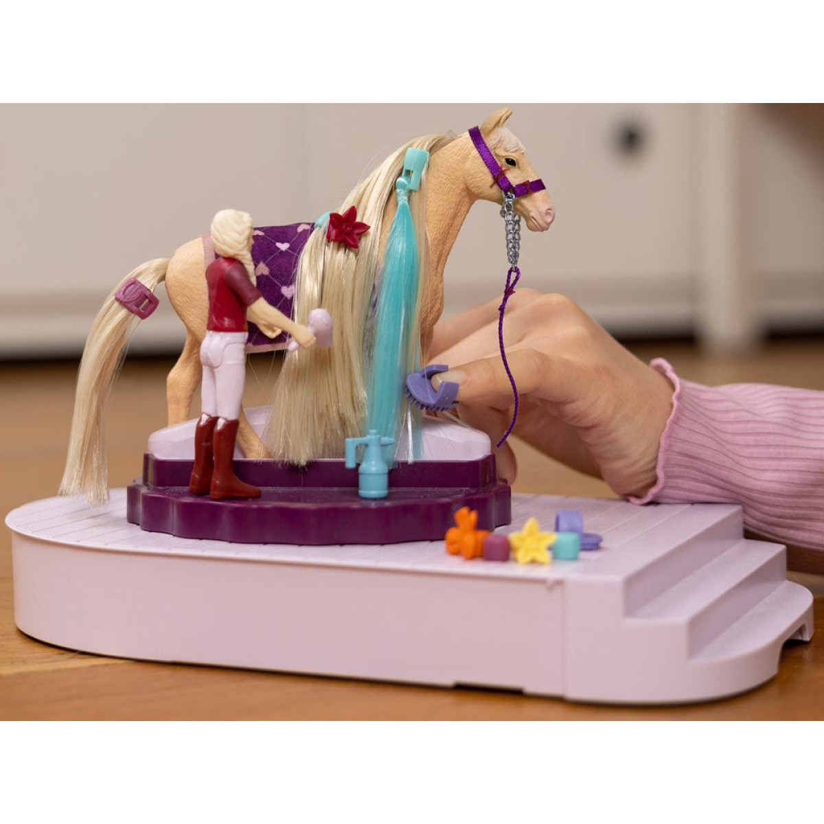 See pakub palju mänguvõimalusi! Nukk on liikuvate jäsemetega, seega saab ta teha erinevaid tegevusi. Hobuse laka ja saba saab kammida ja stiliseerida oma ideede järgi. Paljud aksessuaarid võimaldavad luua erinevaid unikaalseid stiile, et hobune alati suurepärane välja näeks! Pöörlev platvorm lihtsustab stiliseerimist ja tulemuste esitlemist. Mugav sahtel aksessuaaride hoidmiseks aitab hoida korda.
