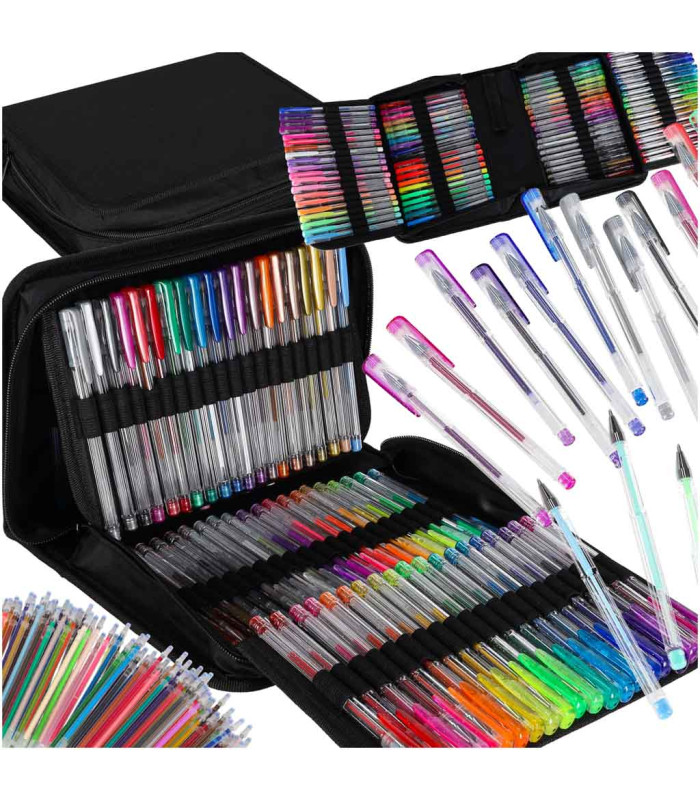 - Komplekti sisu: 28 sädelevat, 14 läikivat, 6 värvilise täitesüdamikuga, 20 neoonset, 14 pastellset, 18 metallik geelpliiatsit ning 100 vahetatavat täitesüdamikku.