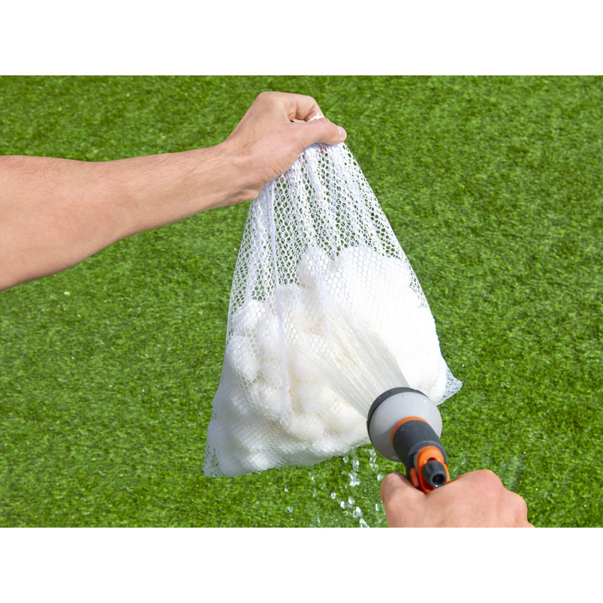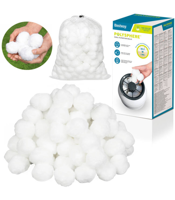 Flowclear Polysphere filtrikuulid on uusim Bestway toode, mis pakub suurepärast lahendust basseini vee filtreerimiseks. Need väiksed kuulid on valmistatud 100% PET-materjalist, mis asendab täielikult tülikat ja rasket liivafiltrit. Need meenutavad oma välimuselt vatti, on kerged, vastupidavad ja tagavad kiirema vee filtreerimise. Üks 500g pakend võib asendada 18 kg liiva. Tänu heale filtreerimisele on teie basseini vesi kristallselge, võimaldades teil ja teie perel nautida värskendavat suplemist kogu suvehooaja jooksul.