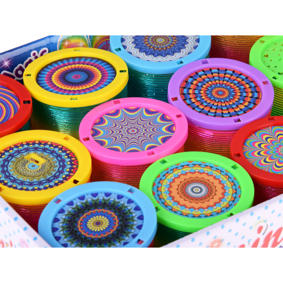 See on klassikalise ja armastatud "vedru" mänguasja ning projektori kombinatsioon, mis kuvab sisse lülitamisel värvilisi tähti ja kuusid. Mänguasjal on mõlemal küljel 6,5 cm läbimõõduga rattad, millel on keerlevate kujunditega mustrilised kleebised.