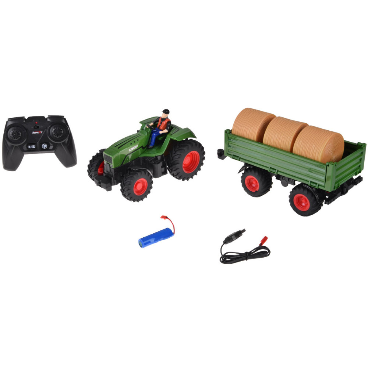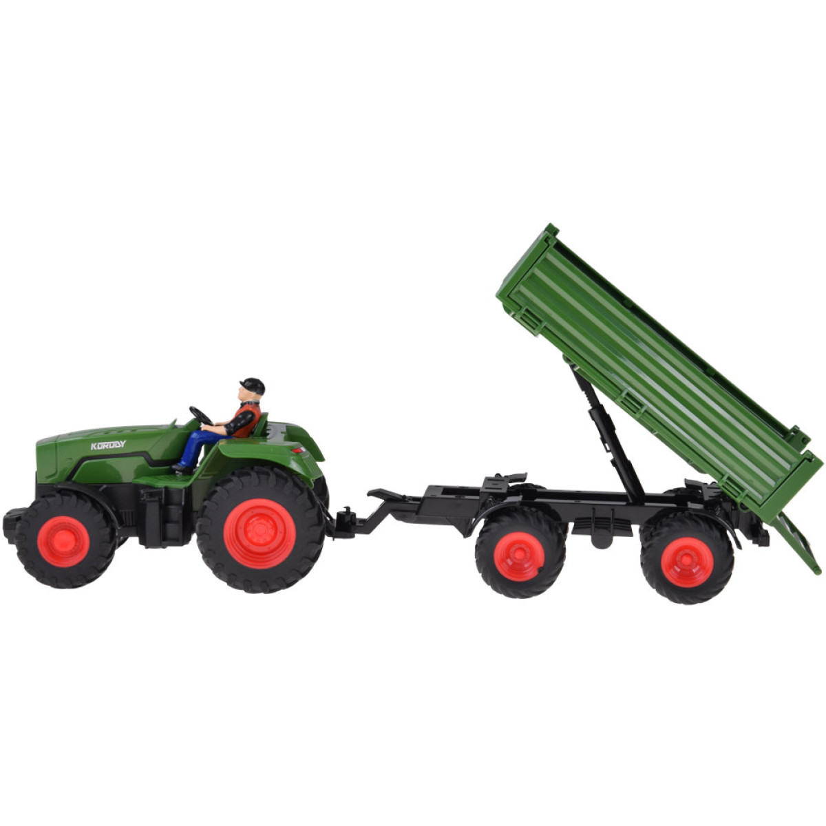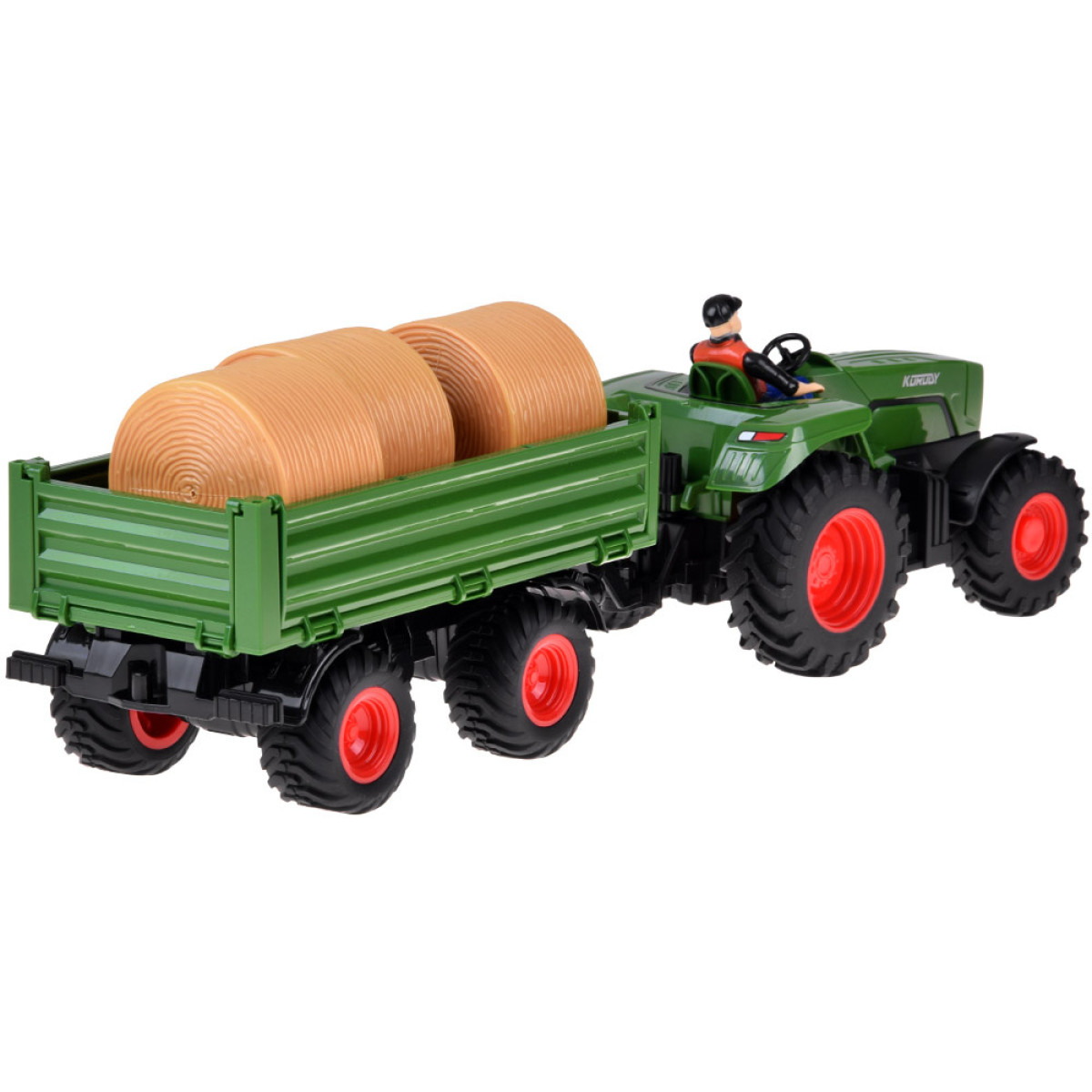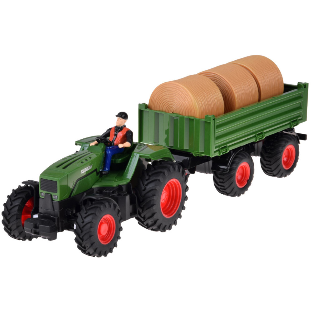 Kaugjuhitav traktor koos järelhaagisega on iga väikese põllumehe unistus. See sobib ideaalselt talu mängimiseks ning mahuka järelhaagise abil saab transportida heinapalle või loomade figuure.