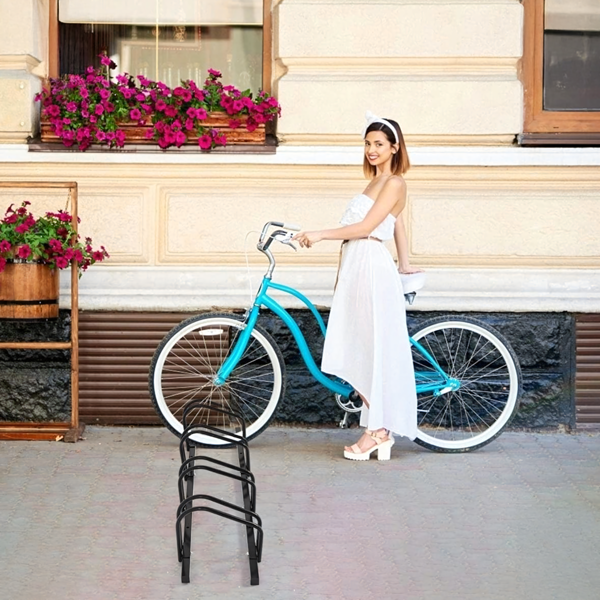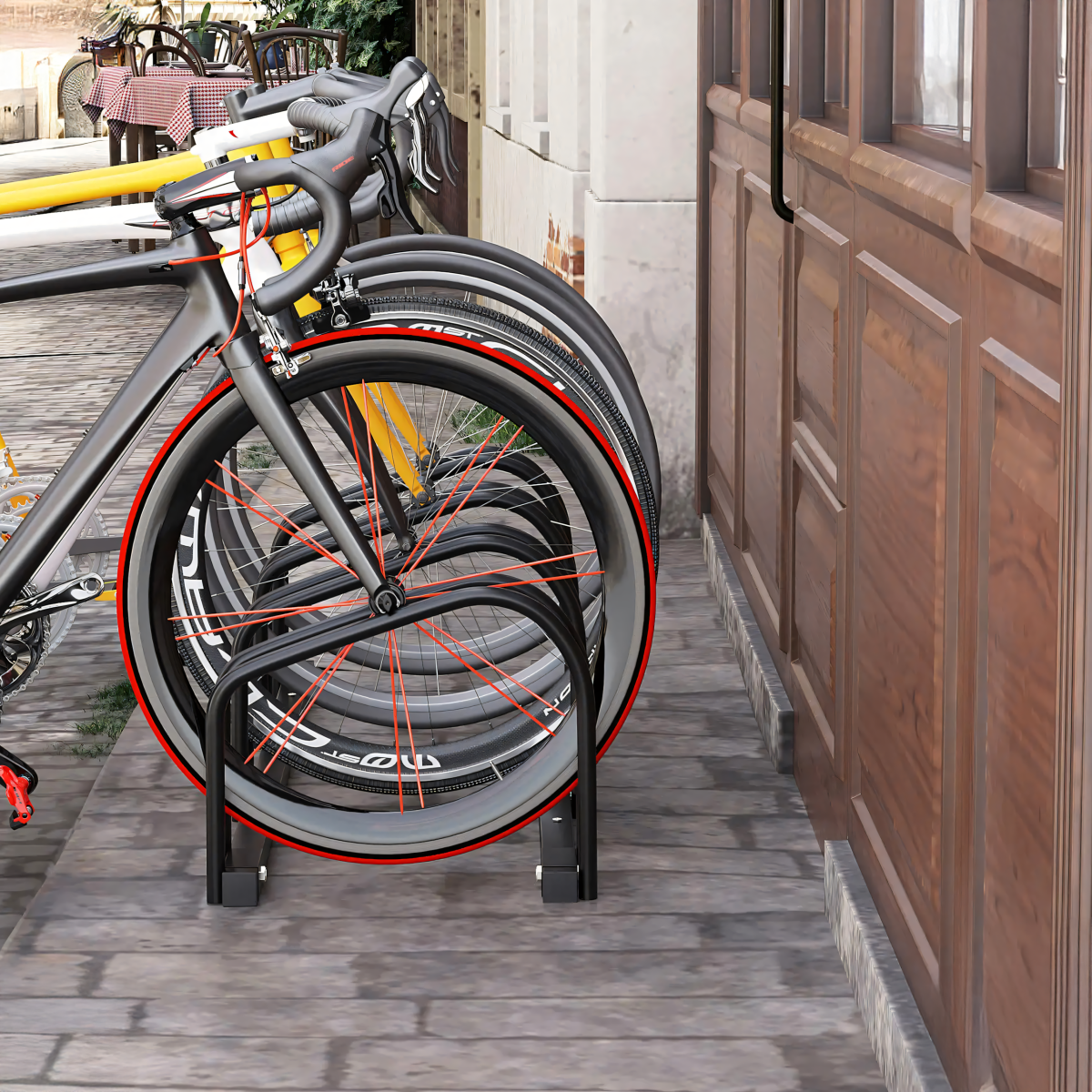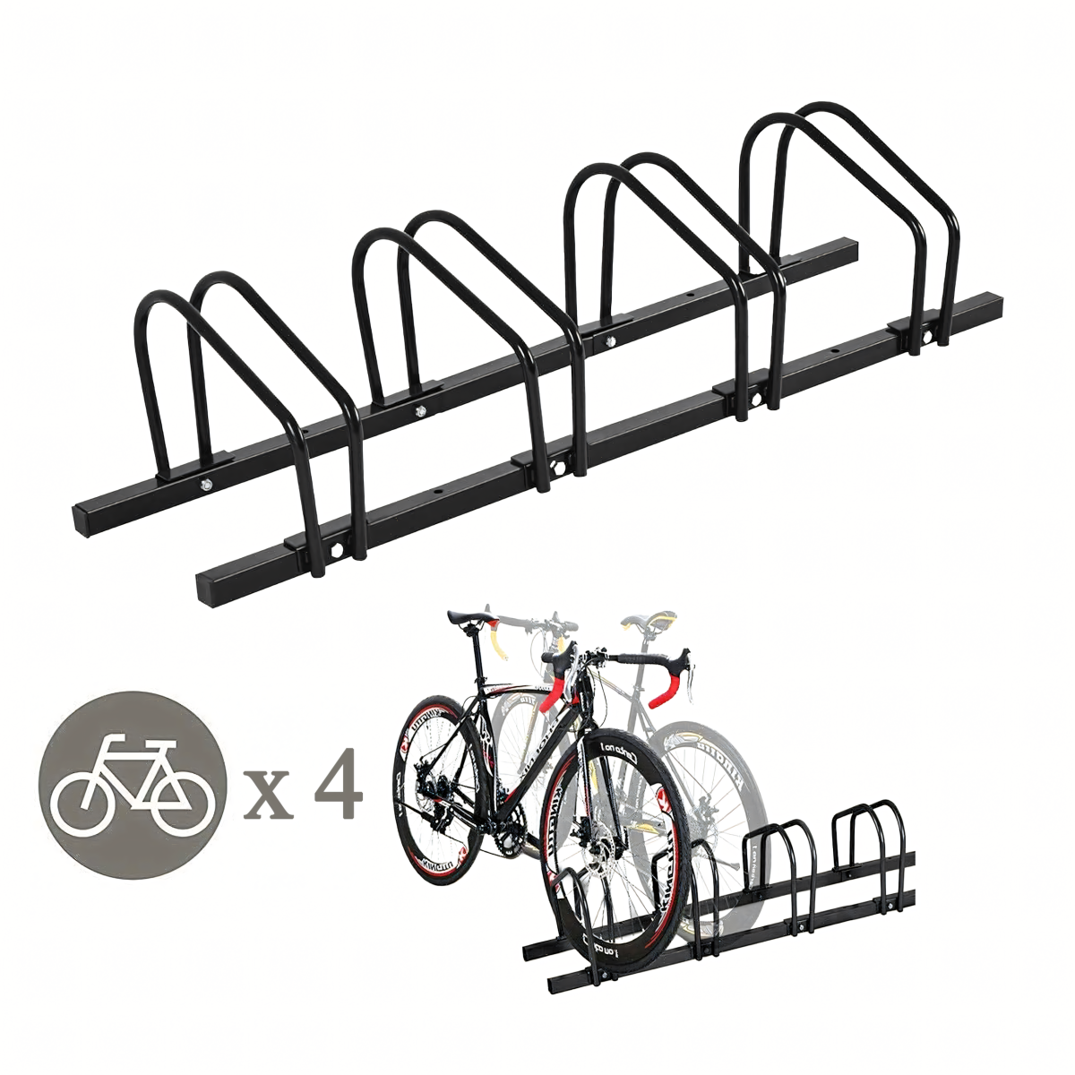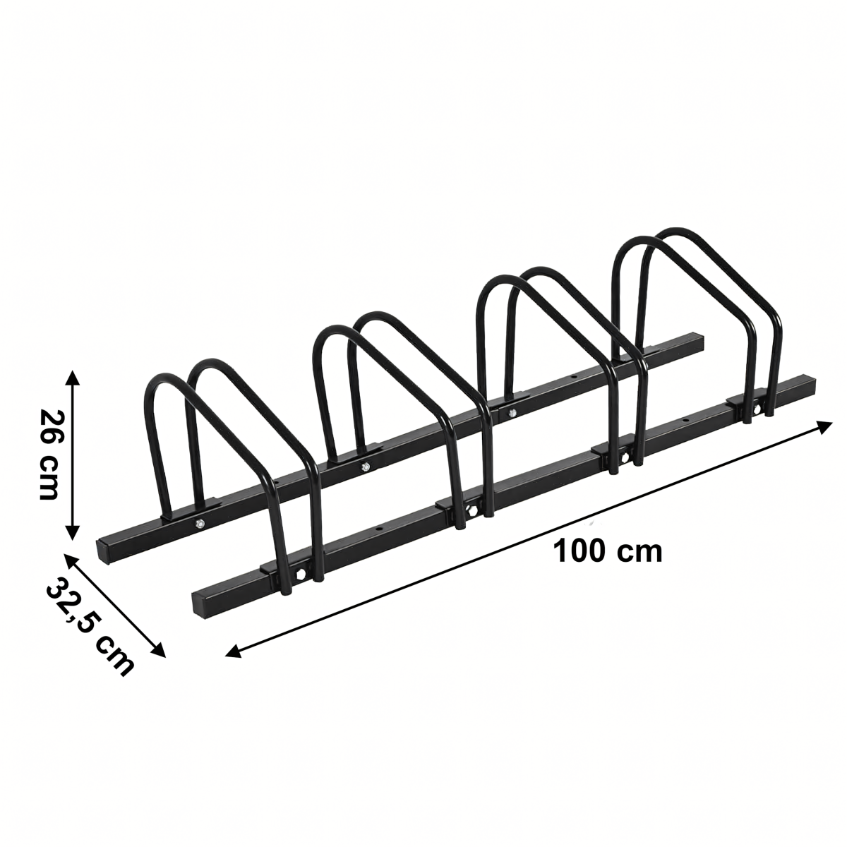 Jalgrattahoidja 4 jalgratta jaoks on valmistatud tugevast mustast terasest, mõõtmetega 100x32,5x26. See on ideaalne lahendus jalgrataste turvaliseks hoidmiseks nii kodus kui ka avalikes kohtades.