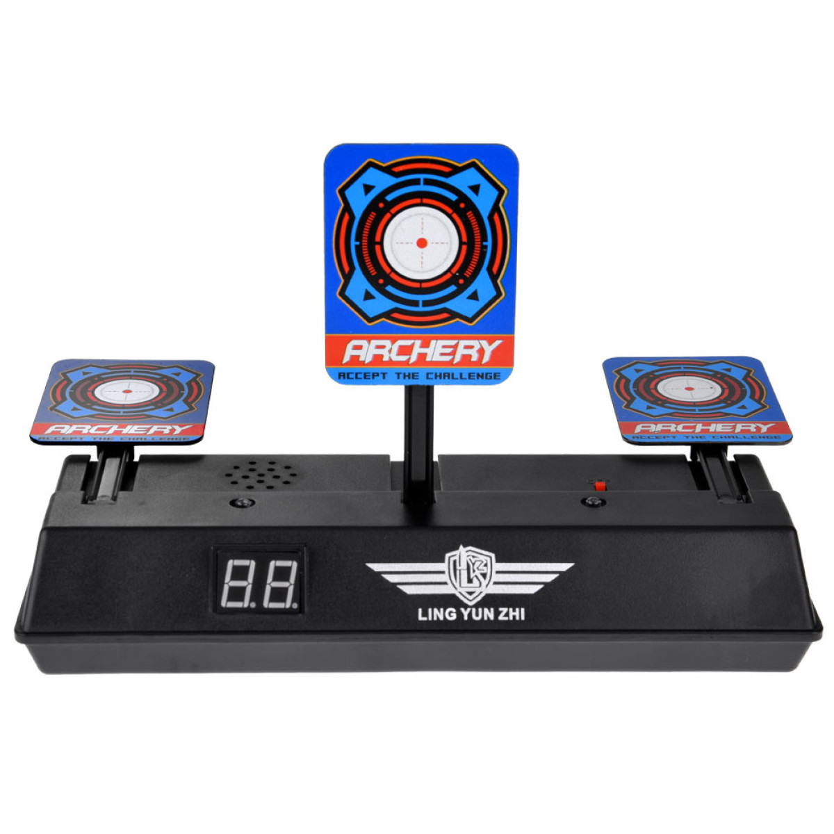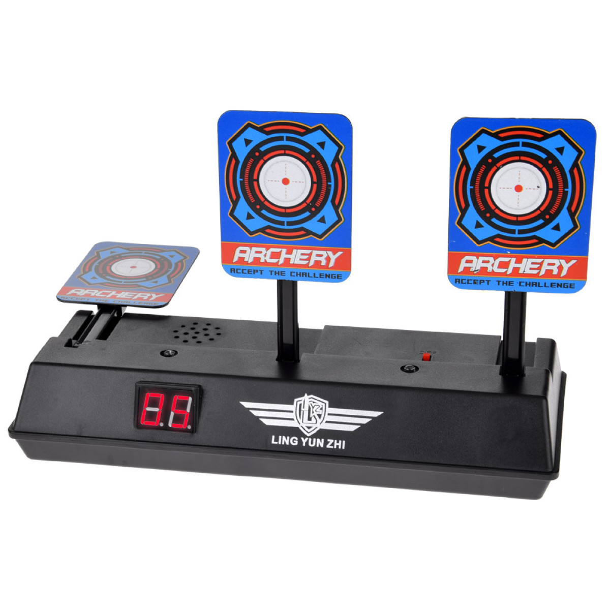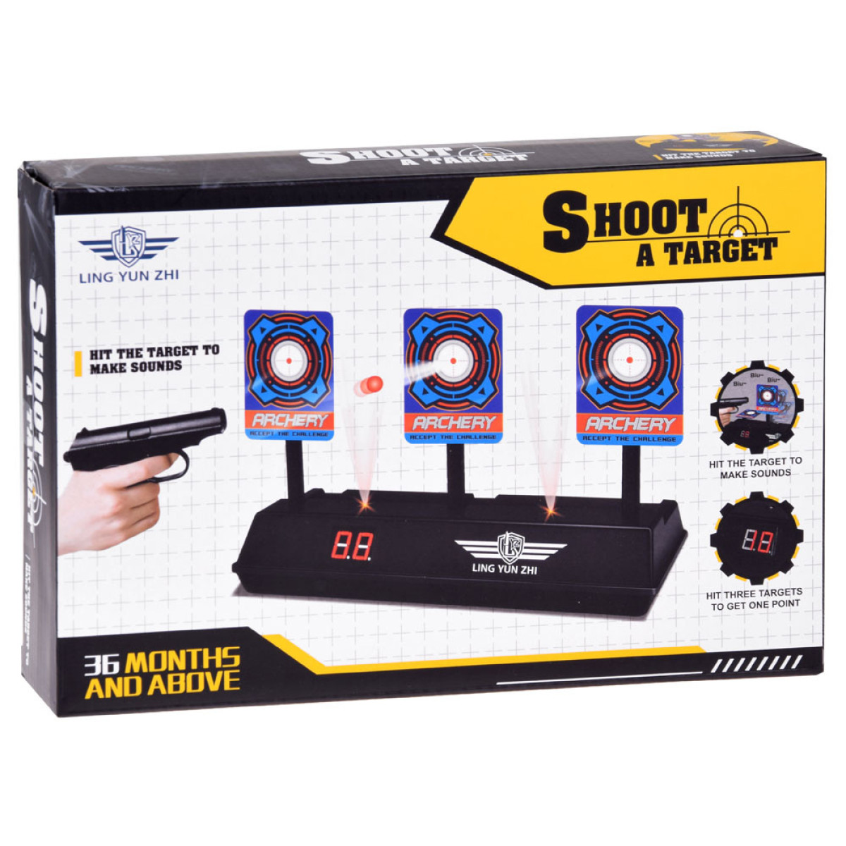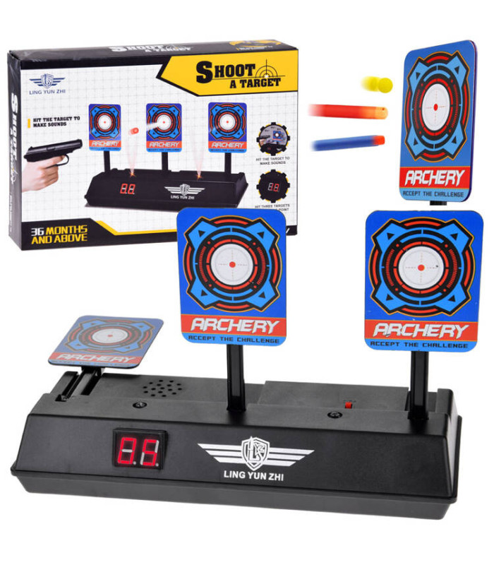 Interaktiivne automaatne 3-punkti märklaua komplekt sobib täpsuslaskmiseks, kasutades näiteks Nerf-tüüpi püstolit või vahtkuulidega relva. Suurepärane idee sihtmärkide pihta laskmise õppimiseks ja mängimiseks. Mänguasi on valmistatud plastikust ning varustatud helide ja valgusefektidega.