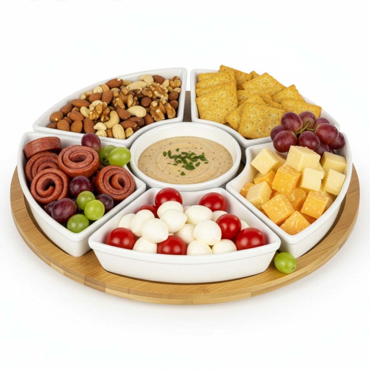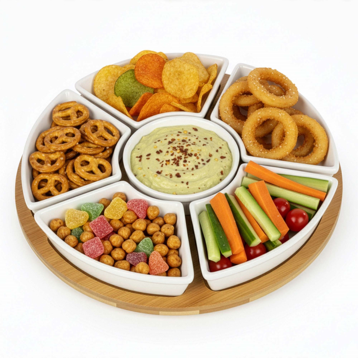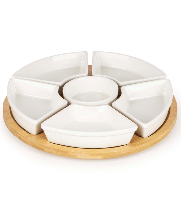 Kaubamärk: Springos® Värv: naturaalne bambus, valge Materjal: bambus, portselan Sektsioonide arv: 5 Kausside arv: 5 Mehhanism: 360° pöörlev laager Mõõdud: Koguläbimõõt: 30 cm Aluse paksus: 1 cm Aluse kõrgus koos pöörleva mehhanismiga: 2 cm Pöörleva mehhanismi läbimõõt: 14 cm Pöörleva mehhanismi paksus: 1 cm Sektsioonide (eraldusribade) laius: 1.5 cm Soonte sügavus: 0.5 cm Kolmnurksed sektsioonid Laius: 13 cm Kõrgus: 8 cm Ümmargune sektsioon Sisemine läbimõõt: 8.5 cm Välimine läbimõõt: 11.5 cm Kolmnurksed kausid Kogukõrgus: 3.5 cm Sisemine laius: 14 cm Sisemine pikkus: 8 cm Sügavus: 2.5 cm Servade paksus: 0.5 cm Maht: 100 ml Ümmargune kauss Välimine läbimõõt: 9.5 cm Sisemine läbimõõt: 8.5 cm Kõrgus: 3.5 cm Servade paksus: 0.5 cm Maht: 100 ml Lisainfo: Toode on heaks kiidetud kokkupuuteks toiduga Komplektis: 1 x pöörlev alus 5 x kaussi