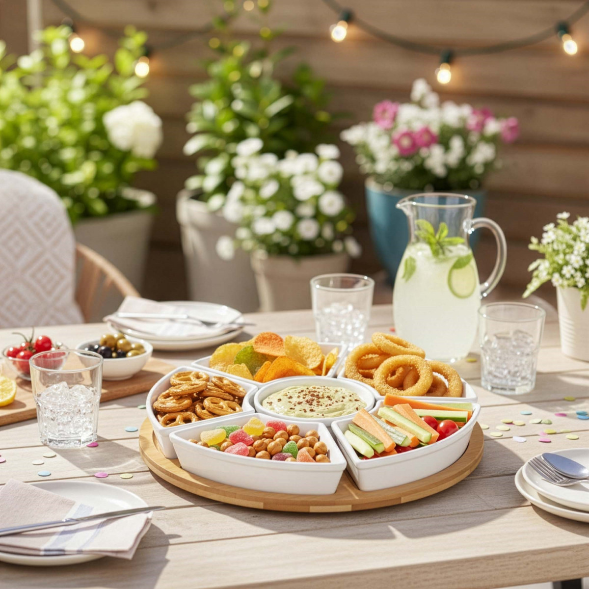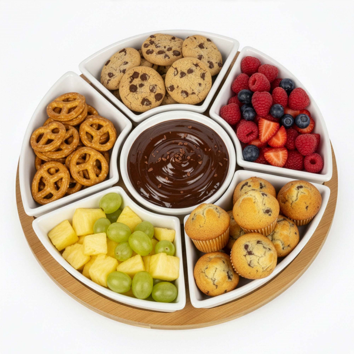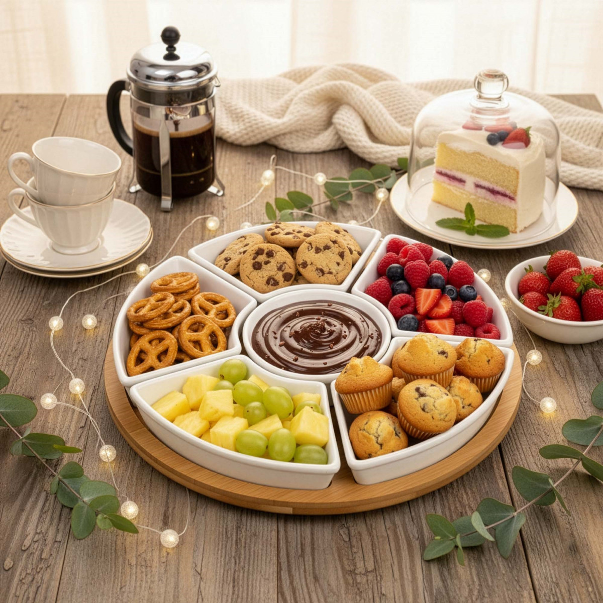 Kaubamärk: Springos® Värv: naturaalne bambus, valge Materjal: bambus, portselan Sektsioonide arv: 5 Kausside arv: 5 Mehhanism: 360° pöörlev laager Mõõdud: Koguläbimõõt: 30 cm Aluse paksus: 1 cm Aluse kõrgus koos pöörleva mehhanismiga: 2 cm Pöörleva mehhanismi läbimõõt: 14 cm Pöörleva mehhanismi paksus: 1 cm Sektsioonide (eraldusribade) laius: 1.5 cm Soonte sügavus: 0.5 cm Kolmnurksed sektsioonid Laius: 13 cm Kõrgus: 8 cm Ümmargune sektsioon Sisemine läbimõõt: 8.5 cm Välimine läbimõõt: 11.5 cm Kolmnurksed kausid Kogukõrgus: 3.5 cm Sisemine laius: 14 cm Sisemine pikkus: 8 cm Sügavus: 2.5 cm Servade paksus: 0.5 cm Maht: 100 ml Ümmargune kauss Välimine läbimõõt: 9.5 cm Sisemine läbimõõt: 8.5 cm Kõrgus: 3.5 cm Servade paksus: 0.5 cm Maht: 100 ml Lisainfo: Toode on heaks kiidetud kokkupuuteks toiduga Komplektis: 1 x pöörlev alus 5 x kaussi
