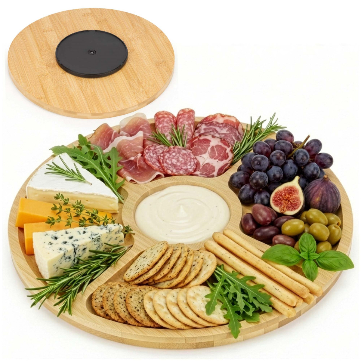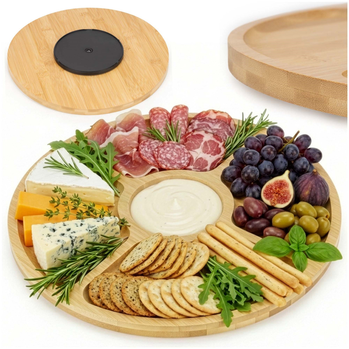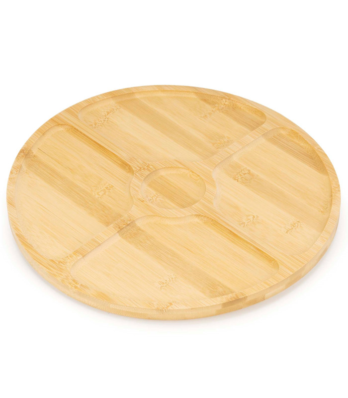 Kaubamärk: Springos® Värv: naturaalne bambus Materjal: bambus Sektsioonide arv: 5 Mehhanism: 360° pöörlev laager Mõõdud: Koguläbimõõt: 33 cm Plaadi paksus: 1.5 cm Plaadi kõrgus koos pöörleva mehhanismiga: 2.5 cm Pöörleva mehhanismi läbimõõt: 14 cm Pöörleva mehhanismi paksus: 1 cm Sektsioonide (eraldusribade) laius: 1 cm Soonte sügavus: 0.5 cm Kolmnurksed sektsioonid Laius: 19 cm Kõrgus: 11 cm Ümmargune sektsioon Sisemine läbimõõt: 6.5 cm Välimine läbimõõt: 8.5 cm Lisainfo: Toode on heaks kiidetud kokkupuuteks toiduga