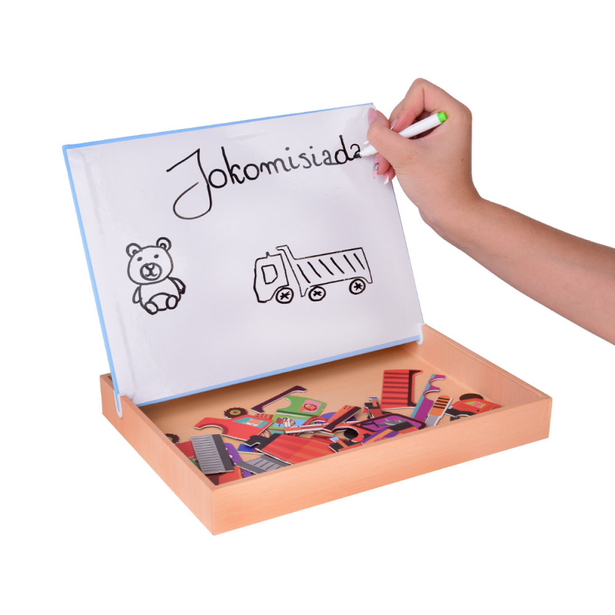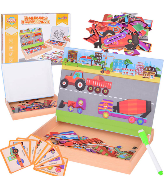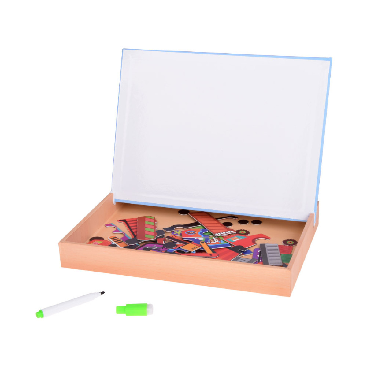 Kahepoolne magnettahvel on ideaalne õppevahend väikestele ehitajatele! Lapsed saavad joonistada sellele kuivpühitava markeriga ning paigutada magnetpuslesid ehitusmasinate piltidega. See multifunktsionaalne tahvel arendab loovust, käelisi oskusi ja kujutlusvõimet, pakkudes samal ajal palju lõbu.