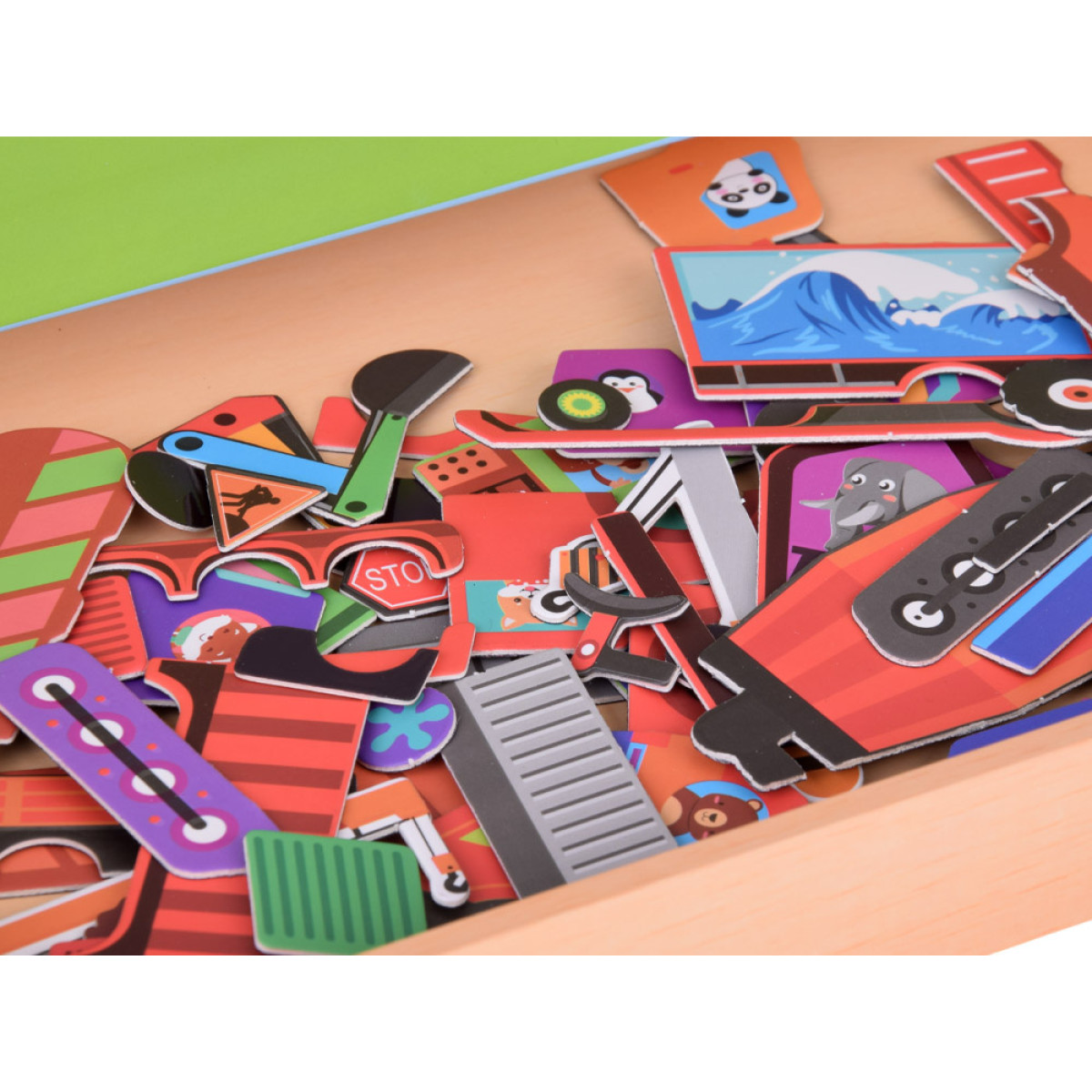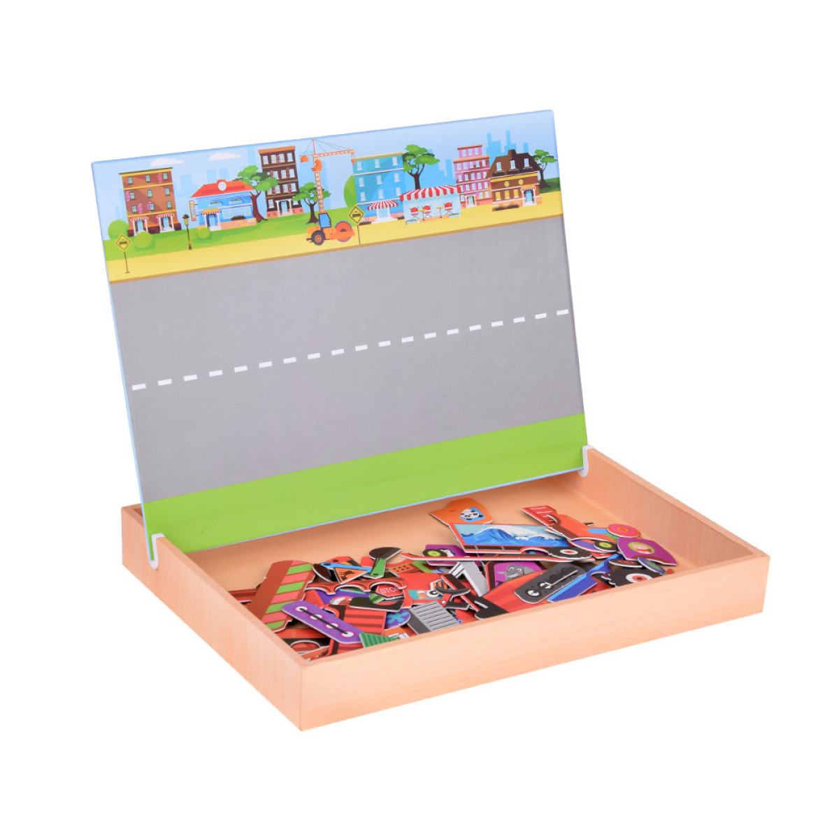 Tahvel sisaldab magnetpuslesid, mis kujutavad ehitusmasinaid nagu kraana, traktor haagisega, buldooser ja kallur ning pind joonistamiseks kuivpühitava markeriga. Lapsed saavad luua masinamustreid või oma kompositsioone, arendades kujutlusvõimet ja käelisi oskusi. Tahvel ei stimuleeri ainult loovust, vaid toetab ka peenmotoorika ja silma-käe koordinatsiooni arengut.