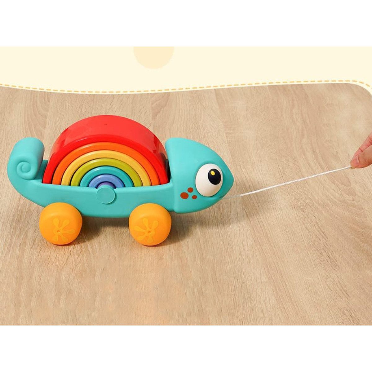 - Mänguasja saab liigutada, tõmmates nööri või tõugates, julgustades last roomama või kameeleonile järgnema.