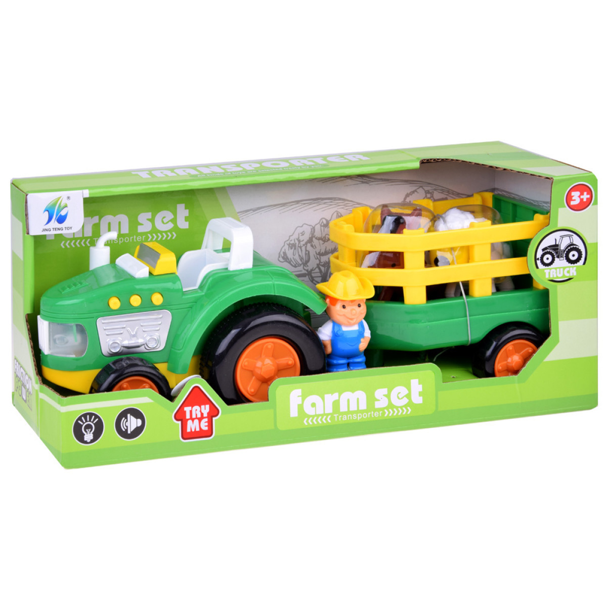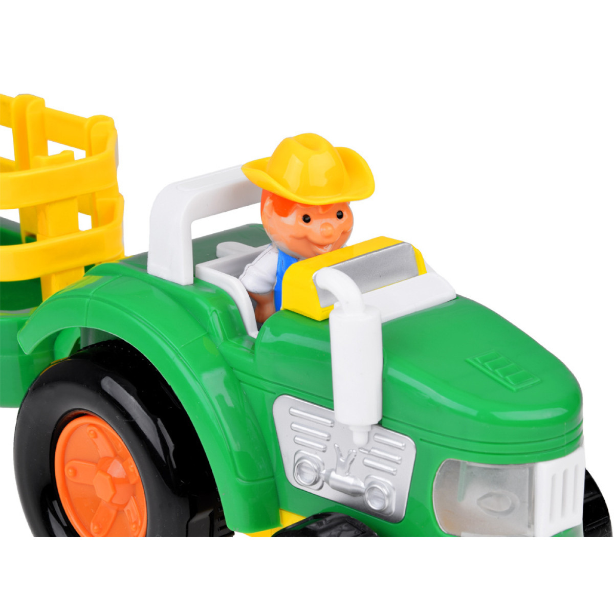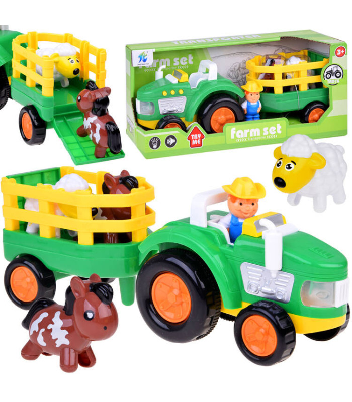Komplekt traktor haagisega, farmeri ja loomakestega pakub lõbusat farmimängu. Rohelise ja kollase värvi traktor on ideaalne valik väikestele sõidukite ja seikluste armastajatele.