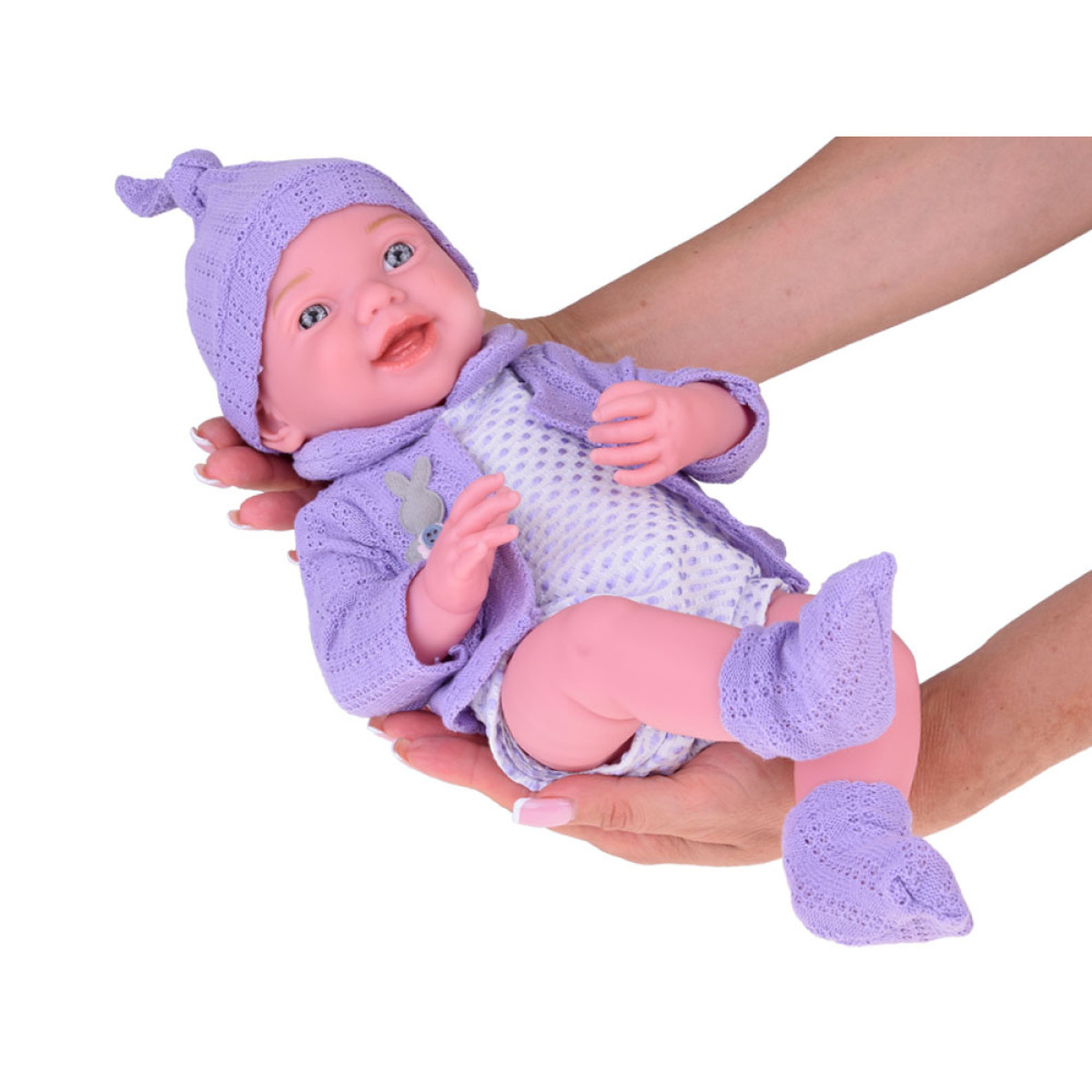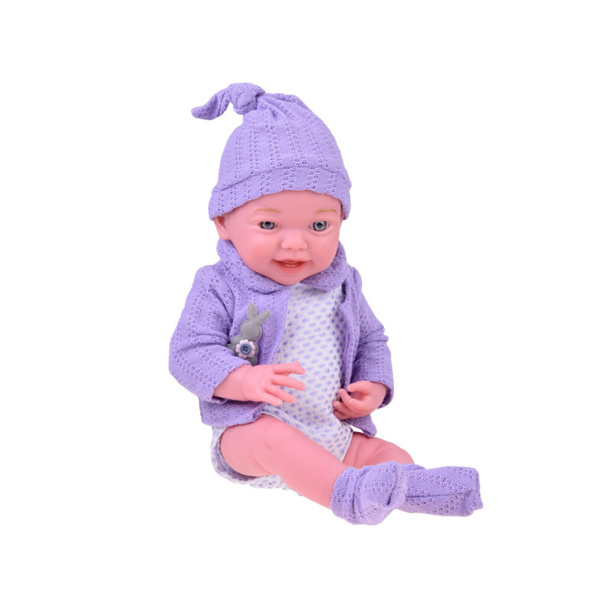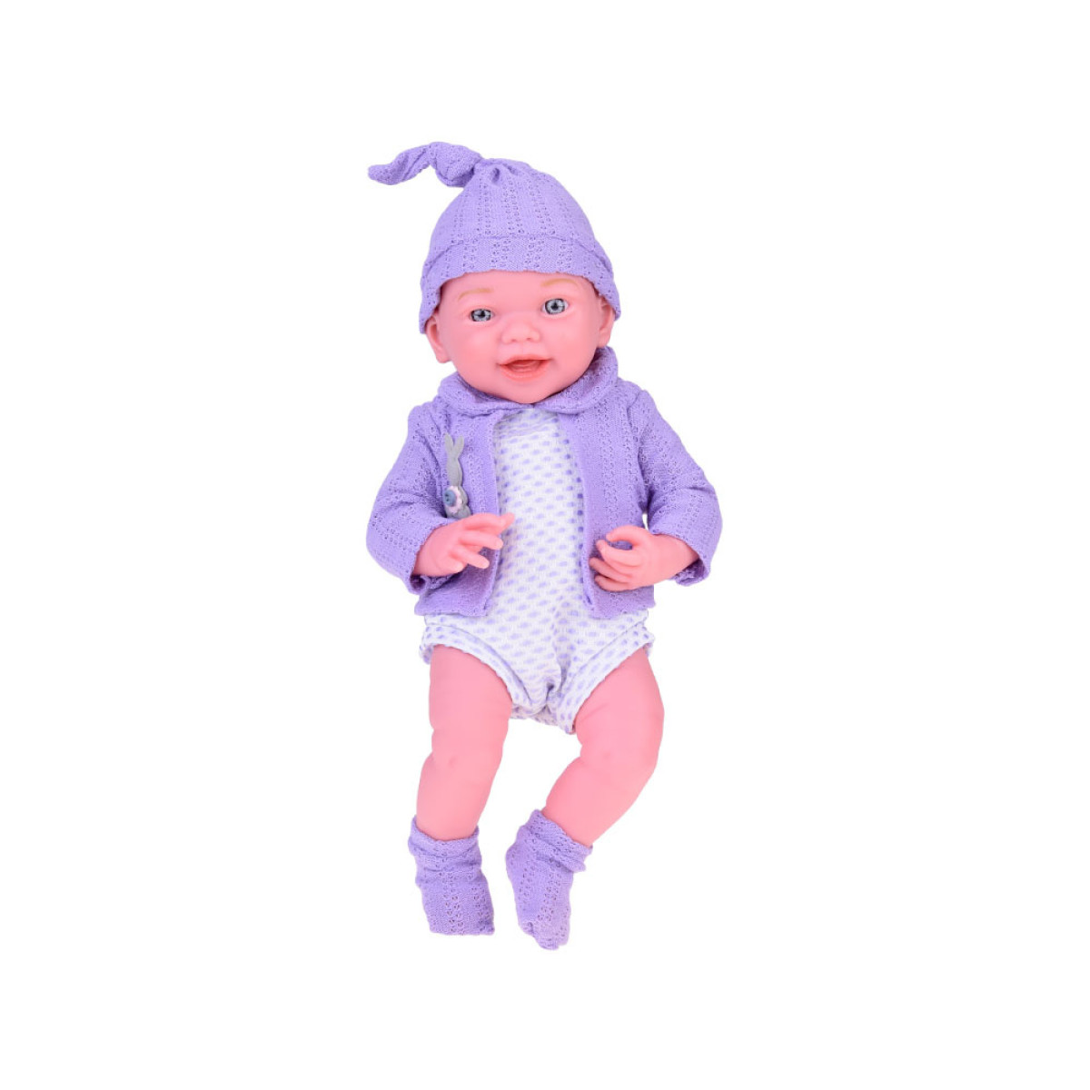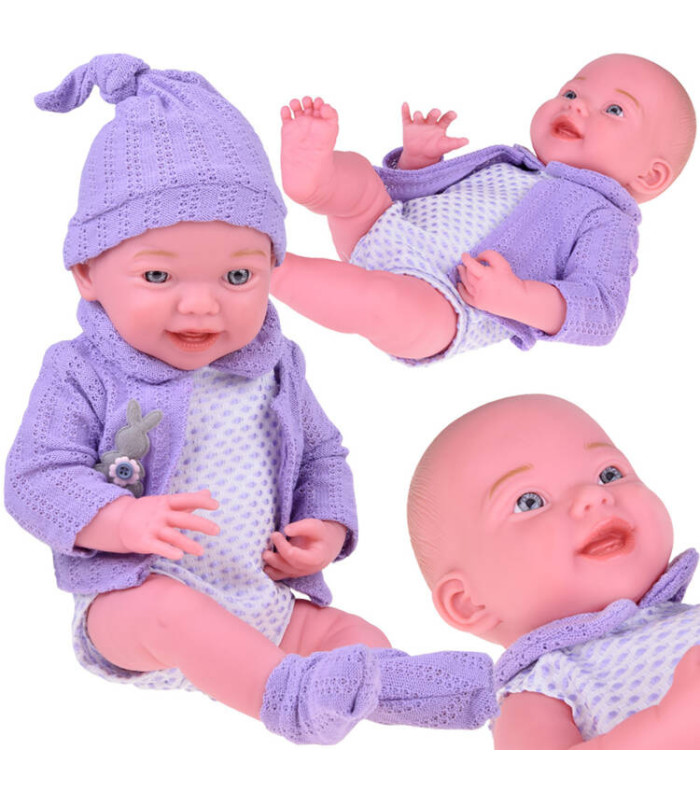 Naeratav beebi lilla kampsuni ja mütsiga on imetlusväärne nukuke, mis toob naeratuse sinu lapse näole. Nukk on riietatud bodysse, kampsunisse, sokkidesse ja mütsi. Lilla kampsun koos mütsi ja sokkidega sobib ideaalselt heleda, lilla täppidega bodiga. Riided on hoolikalt valmistatud, pöörates suurt tähelepanu detailidele, mis veelgi rõhutab selle erilise mänguasja realismi ja võlu. Nukul on liikuvad jäsemed.