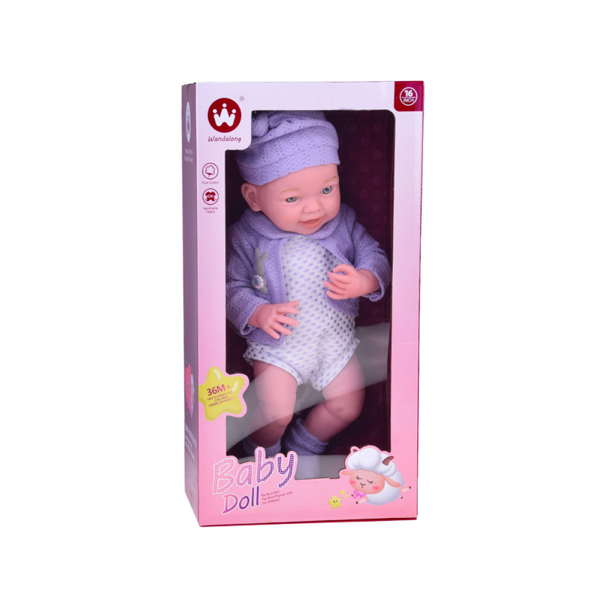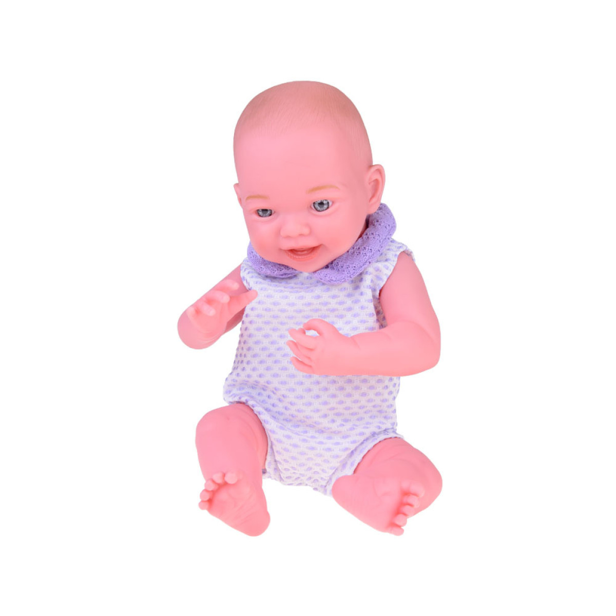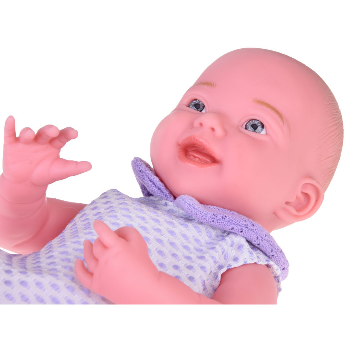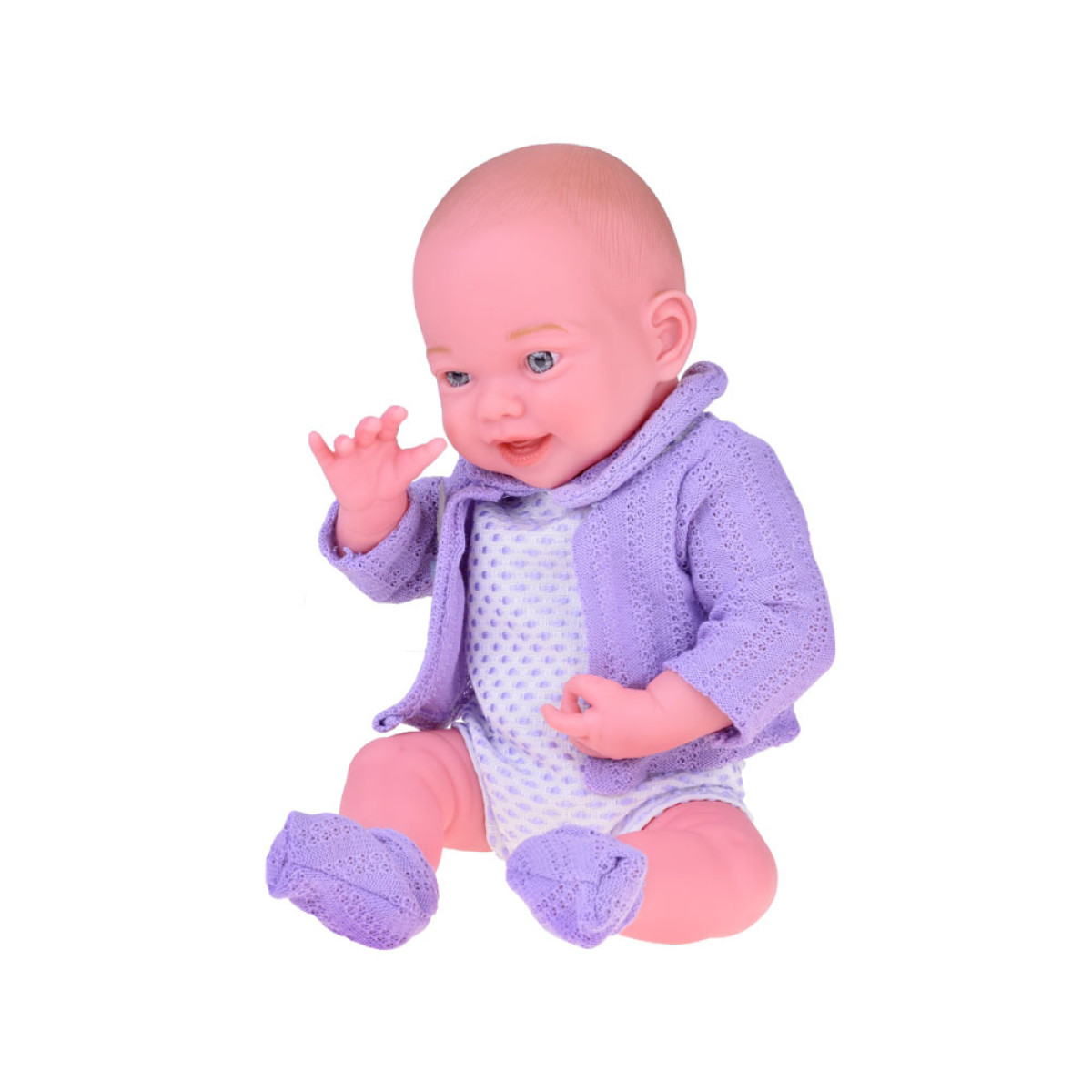 Naeratav beebi lilla kampsuni ja mütsiga on imetlusväärne nukuke, mis toob naeratuse sinu lapse näole. Nukk on riietatud bodysse, kampsunisse, sokkidesse ja mütsi. Lilla kampsun koos mütsi ja sokkidega sobib ideaalselt heleda, lilla täppidega bodiga. Riided on hoolikalt valmistatud, pöörates suurt tähelepanu detailidele, mis veelgi rõhutab selle erilise mänguasja realismi ja võlu. Nukul on liikuvad jäsemed.