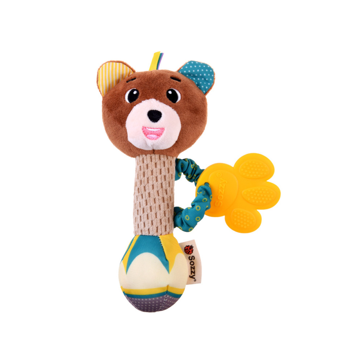 - Mänguasjaga on kaasas praktiline ja ohutu, silikoonist hambarõngas käpa kujul. Selle erilised tekstuurid masseerivad õrnalt valutavaid igemeid ja pakuvad kohe leevendust hammaste tulemise perioodil.