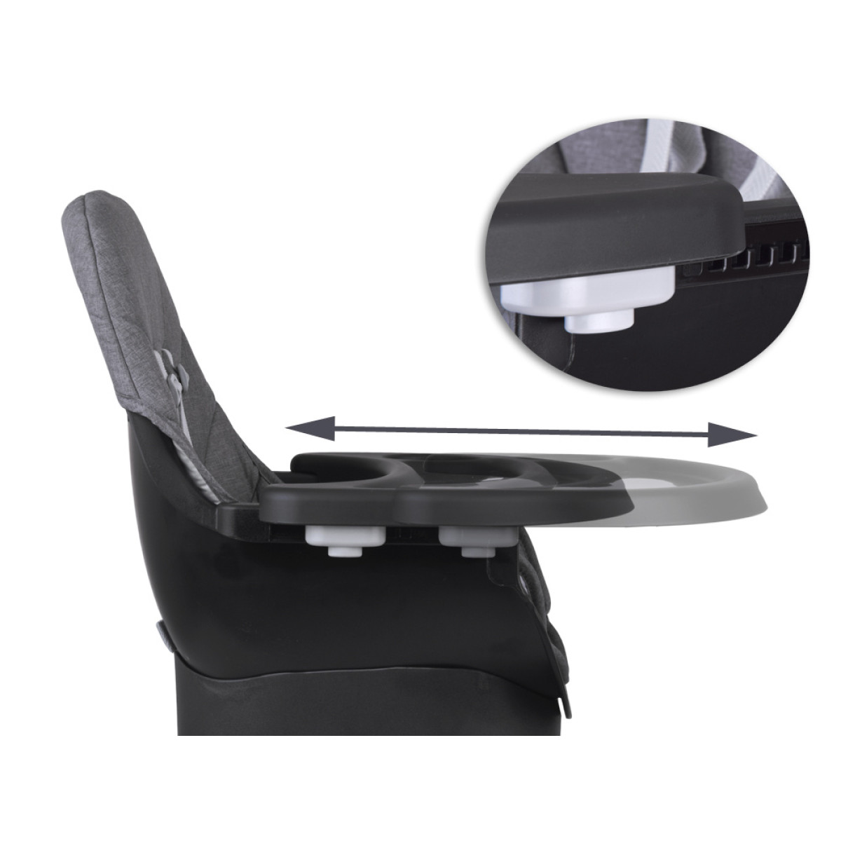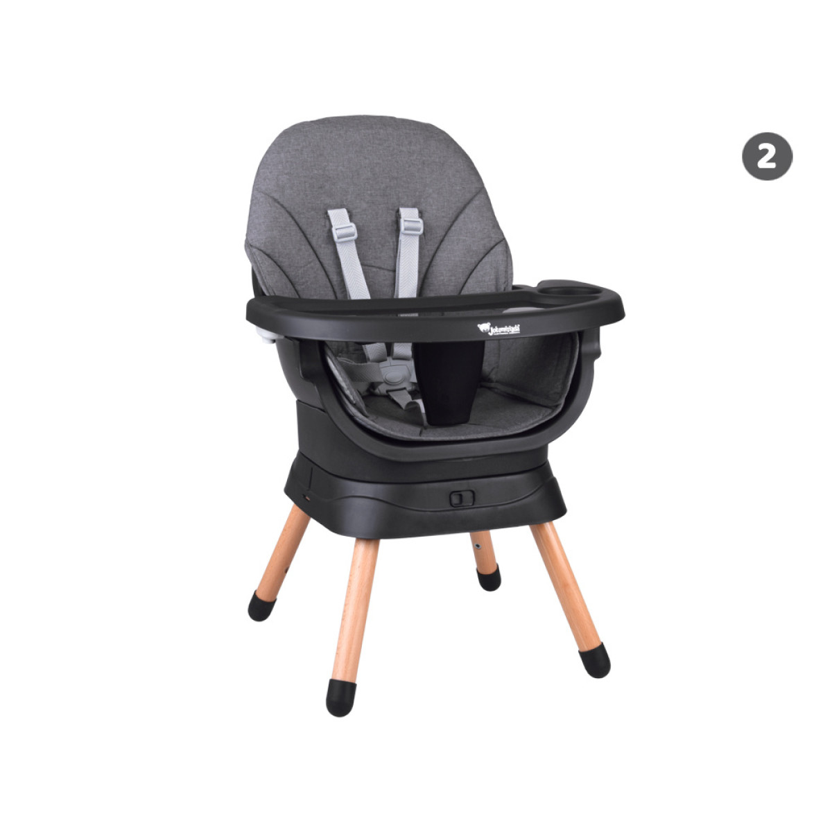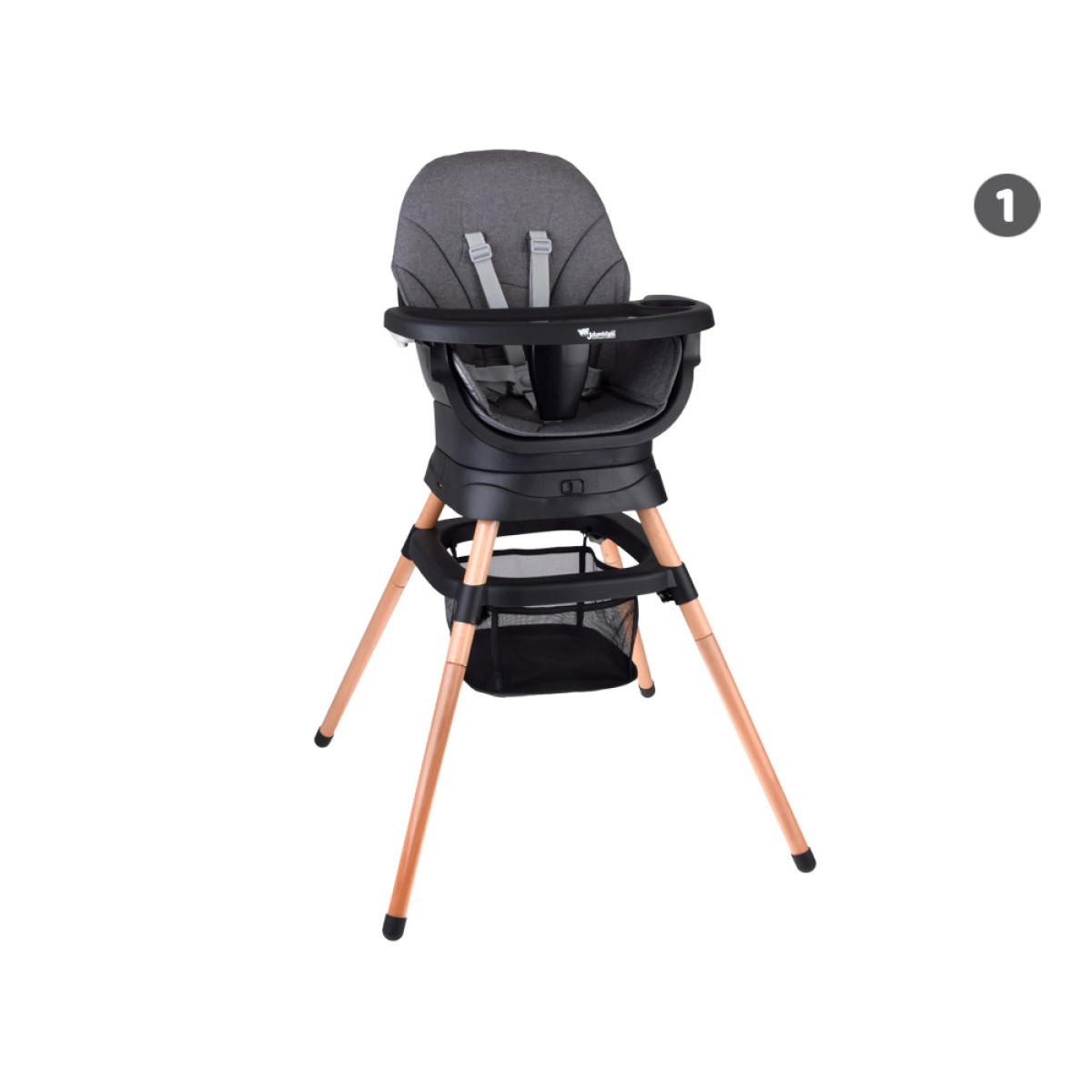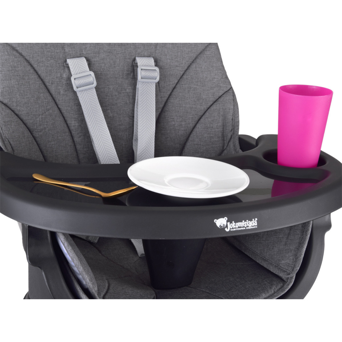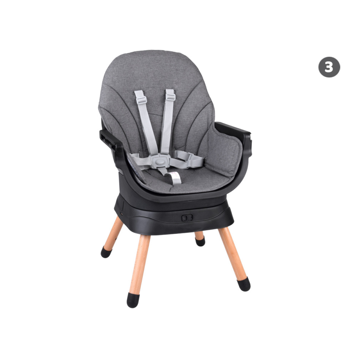 - Söögitool – mugav ja stabiilne, reguleeritava aluse ja turvarihmadega, tagab mugavuse nii lapsele kui ka vanemale. Alus on vormitud, eemaldatav ja kergesti puhastatav – piisab voolava vee all loputamisest või nõudepesumasinas pesemisest. Lisaks on tooli all praktiline korvike, kuhu saab panna kasulikke esemeid, nagu näiteks mähkmelapi, niisked salvrätikud või lemmikmänguasja.