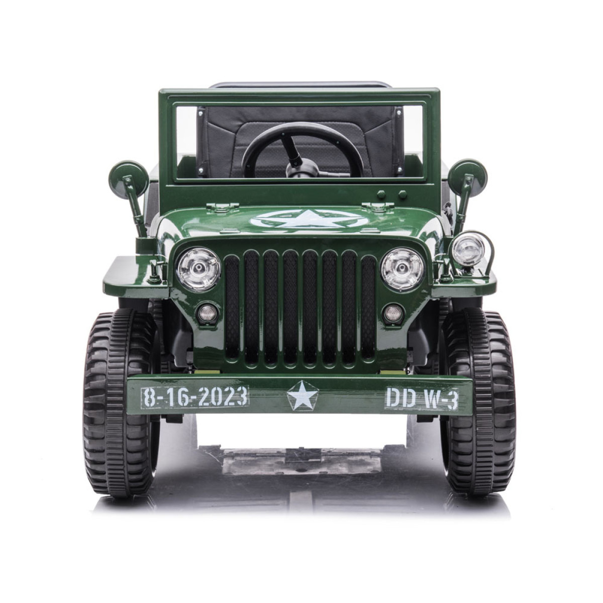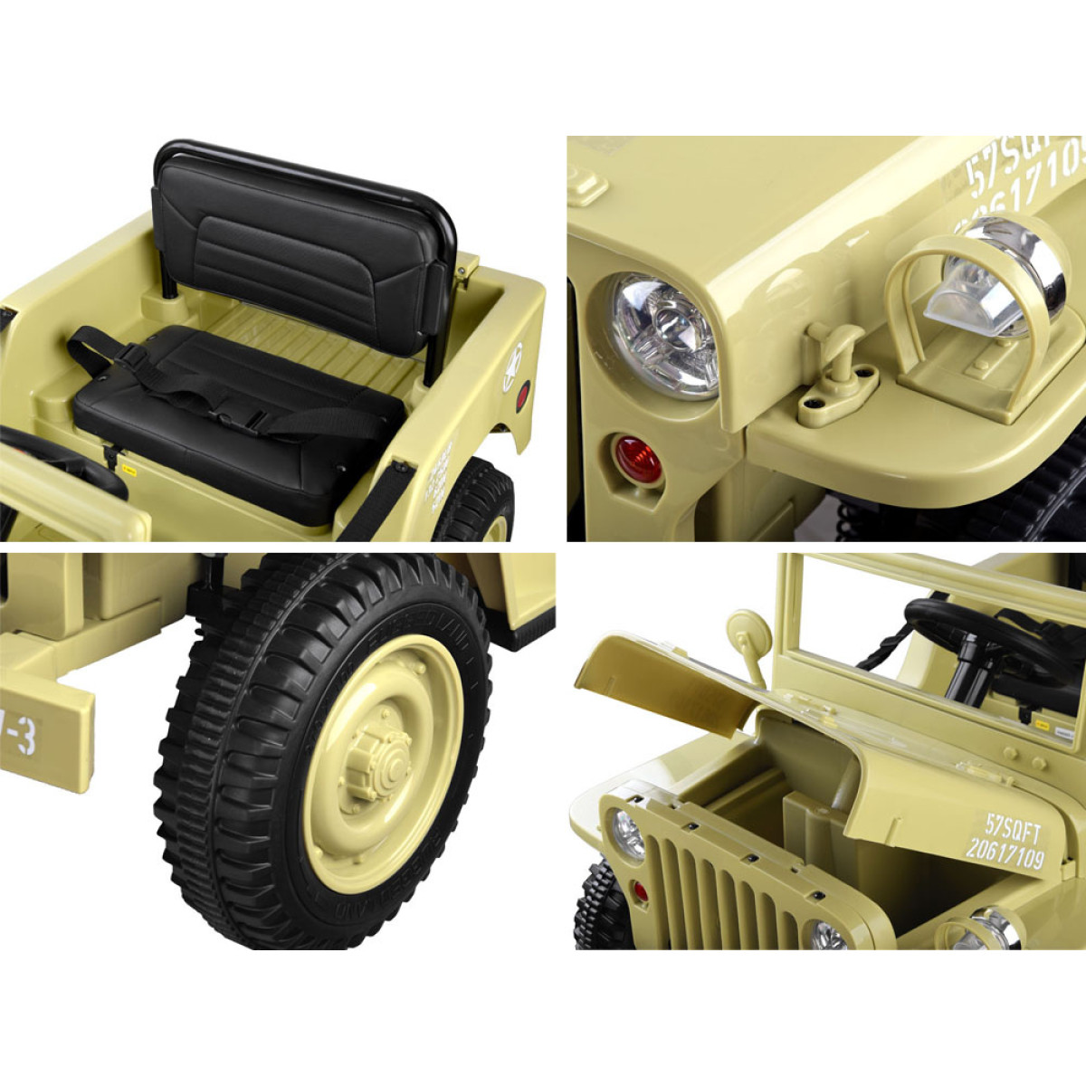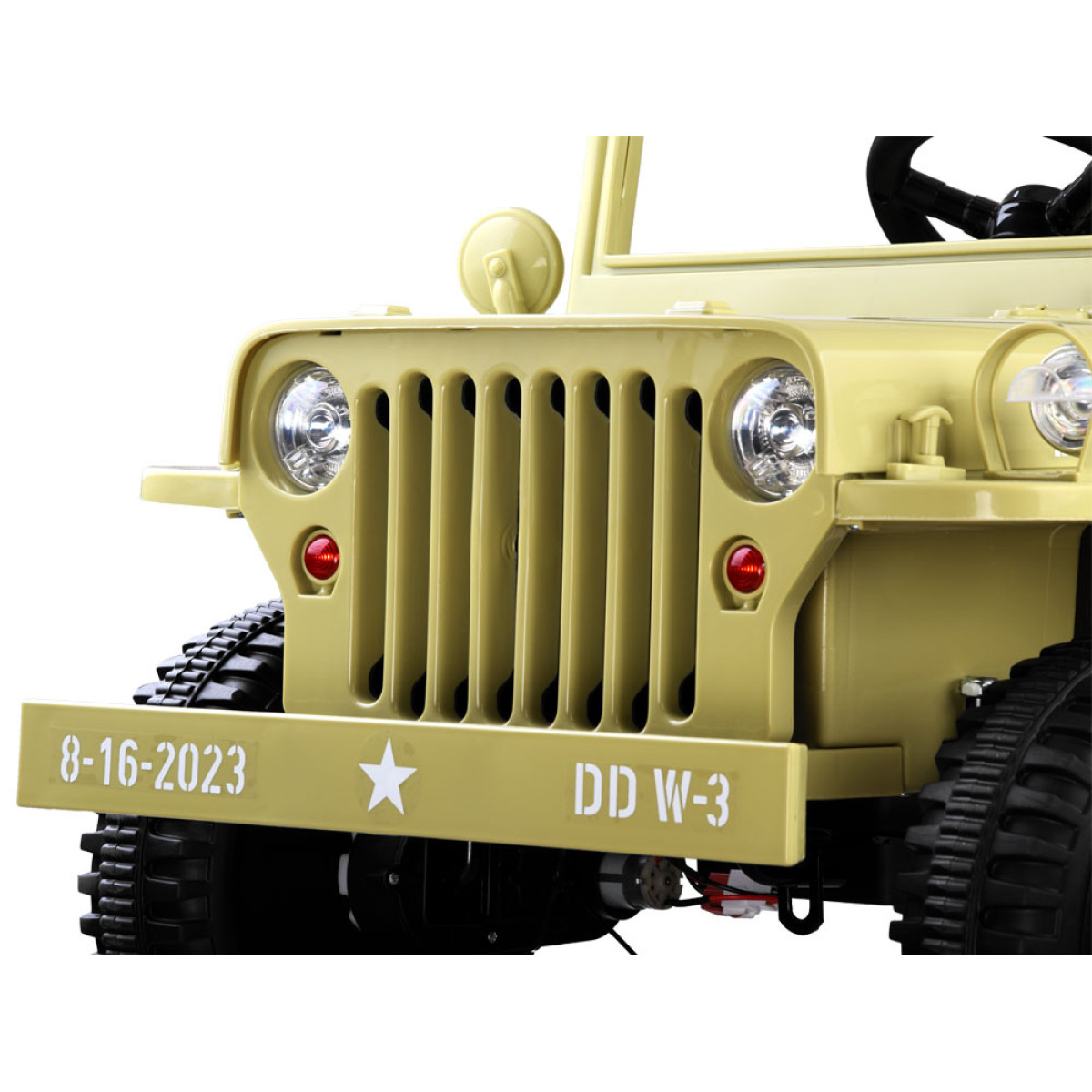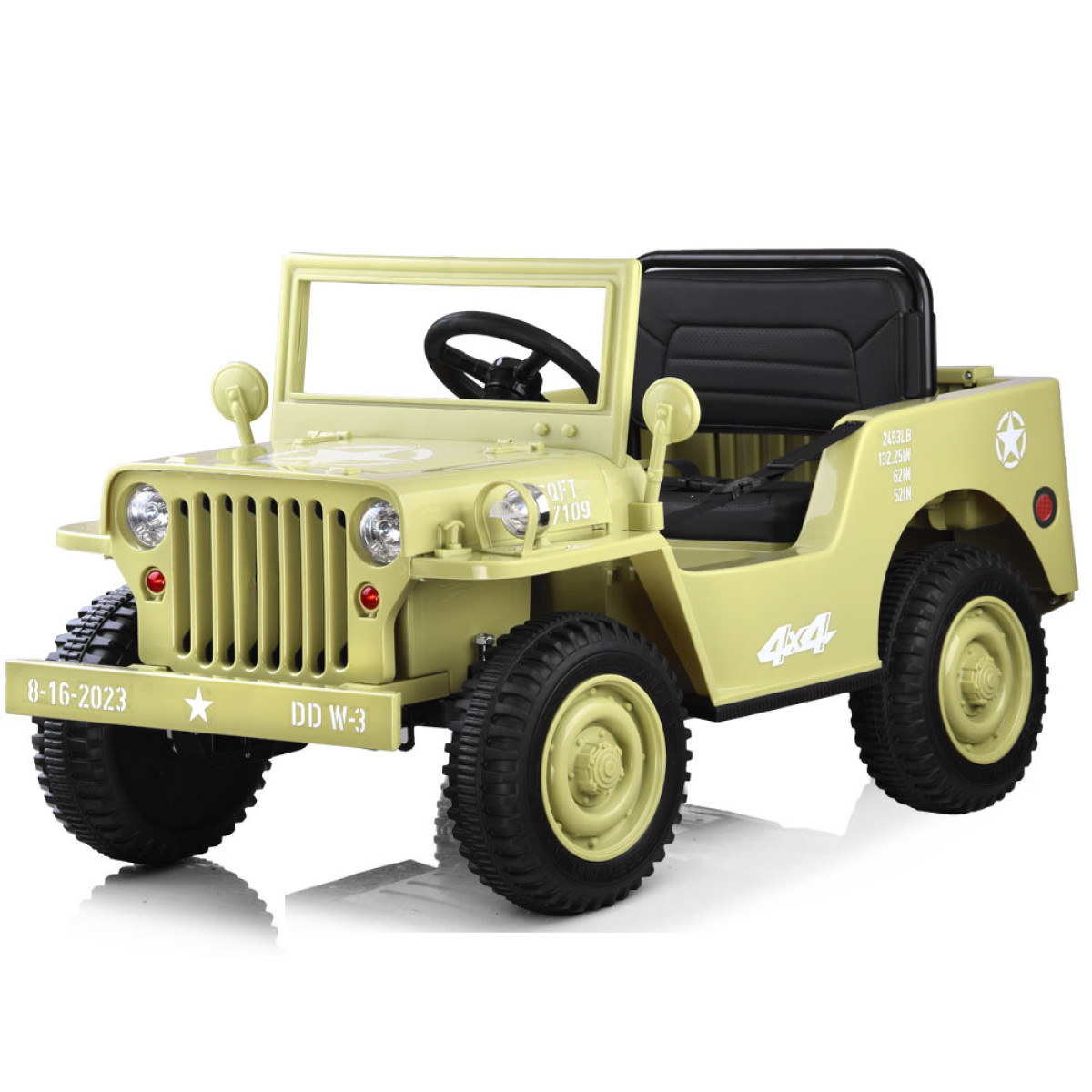 Sõjaline maastikusõiduk on suurepärane valik kõigile lastele, kes armastavad sõjateemalisi mänge. See tugev ja võimas retro sõiduk suudab kindlasti täita sõjalisi ülesandeid. Maastikusõiduk on varustatud kõikide vajalike lisaseadmetega ja tugevdatud osadega. Sõidukil on pagasiruum, labidas, heliefektid, valgusefektid, mugav iste ja turvavööd. Sõidukit saab juhtida kaugjuhtimispuldiga või iseseisvalt juhi poolt.