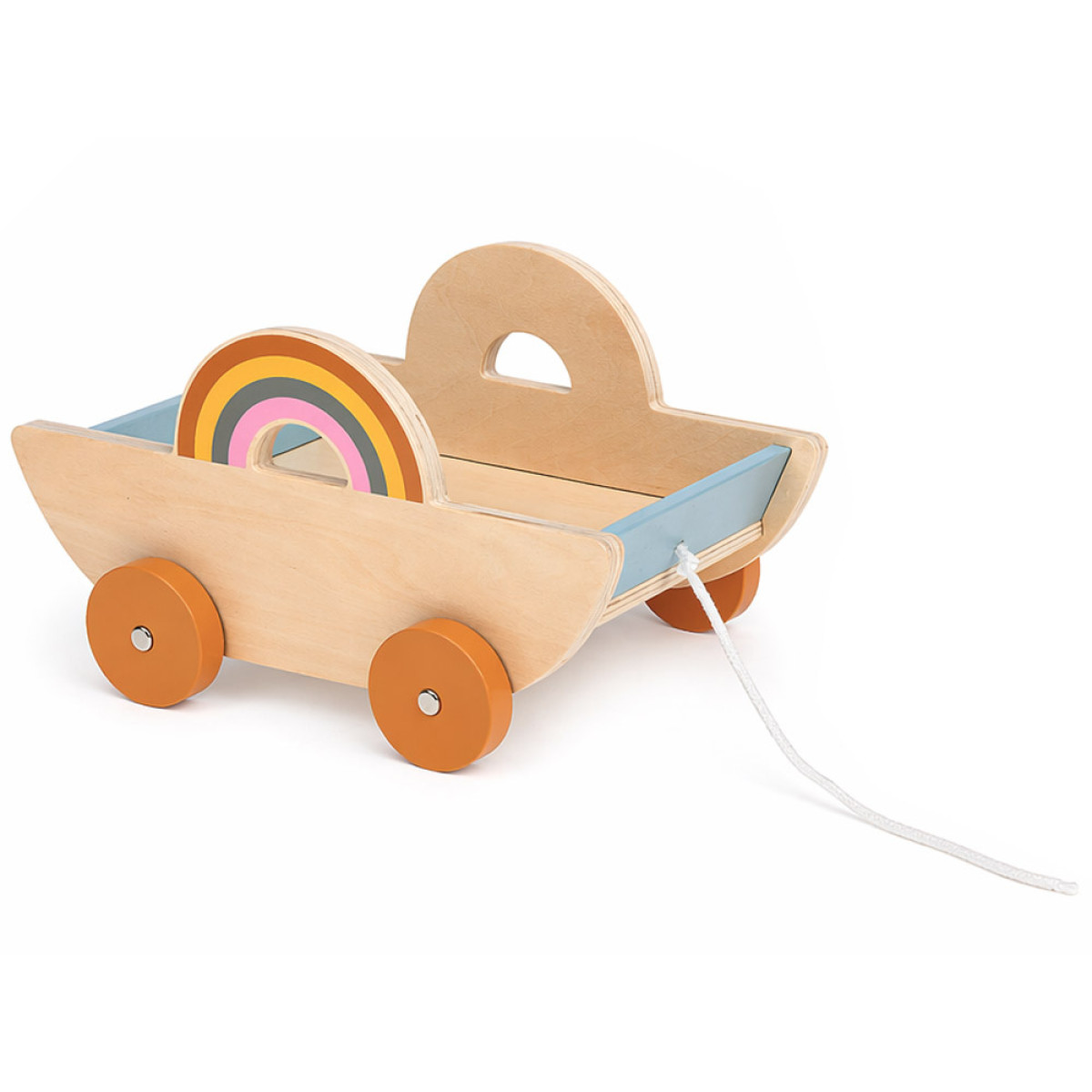 See puidust mänguasi on valmistatud kvaliteetsest heledast puidust. rattad, käepidemed ja käru esiosa on kaunites pastelsetes toonides. esiosas olevast avast jookseb läbi nöör, mille abil saab käru mugavalt vedada. vajadusel saab nööri vahetada pikema vastu.