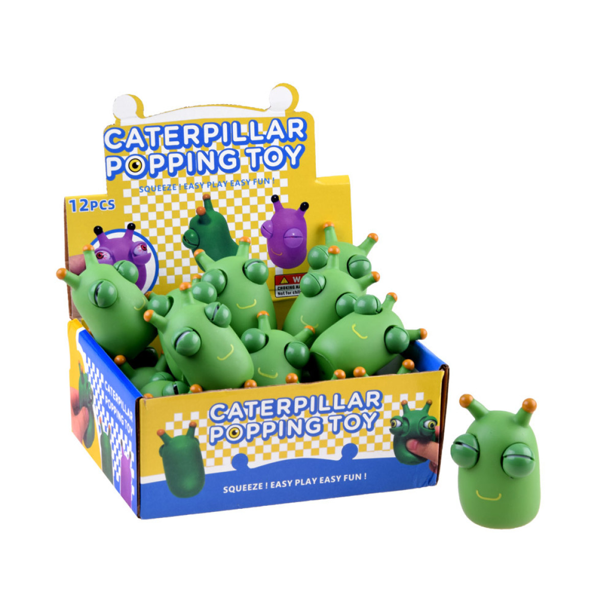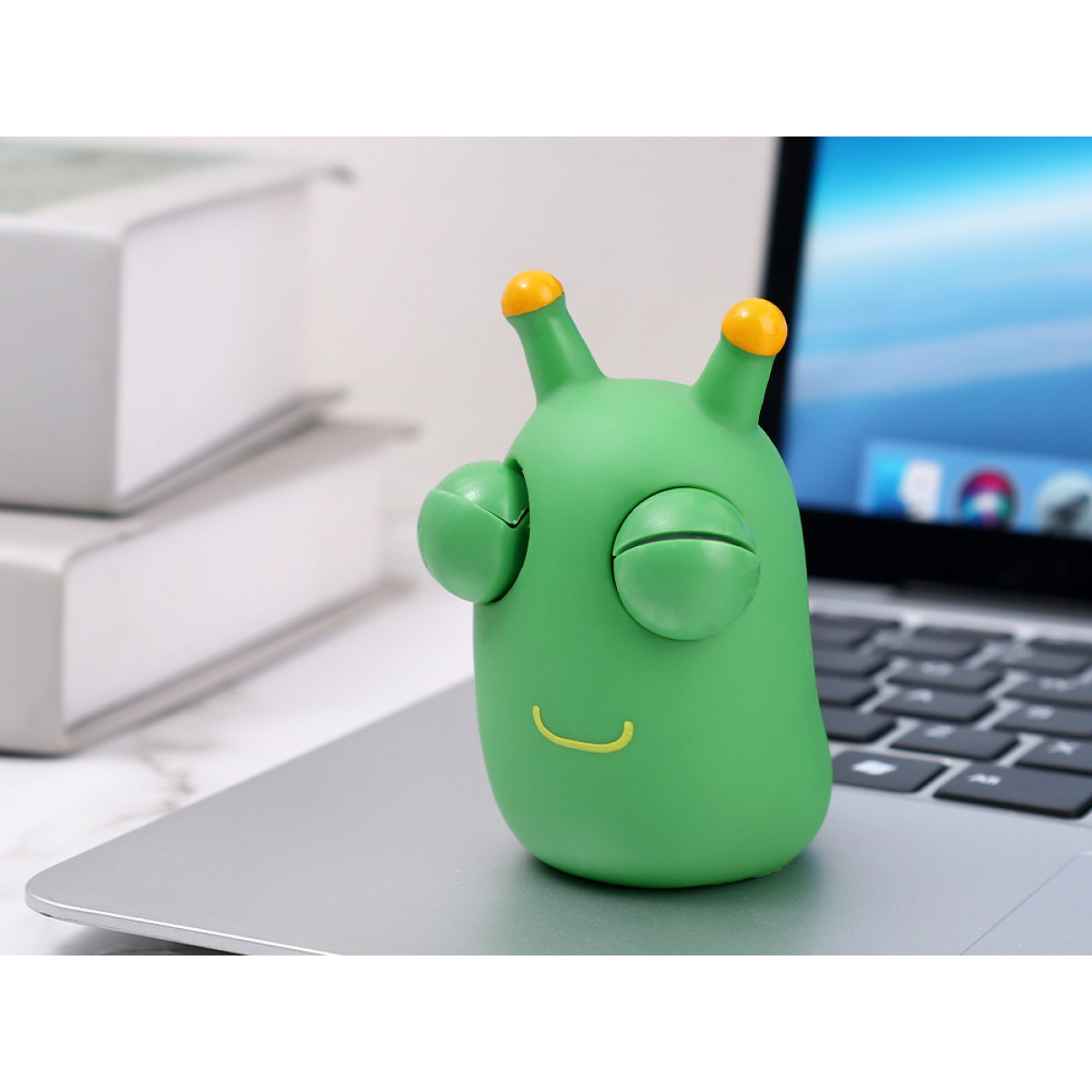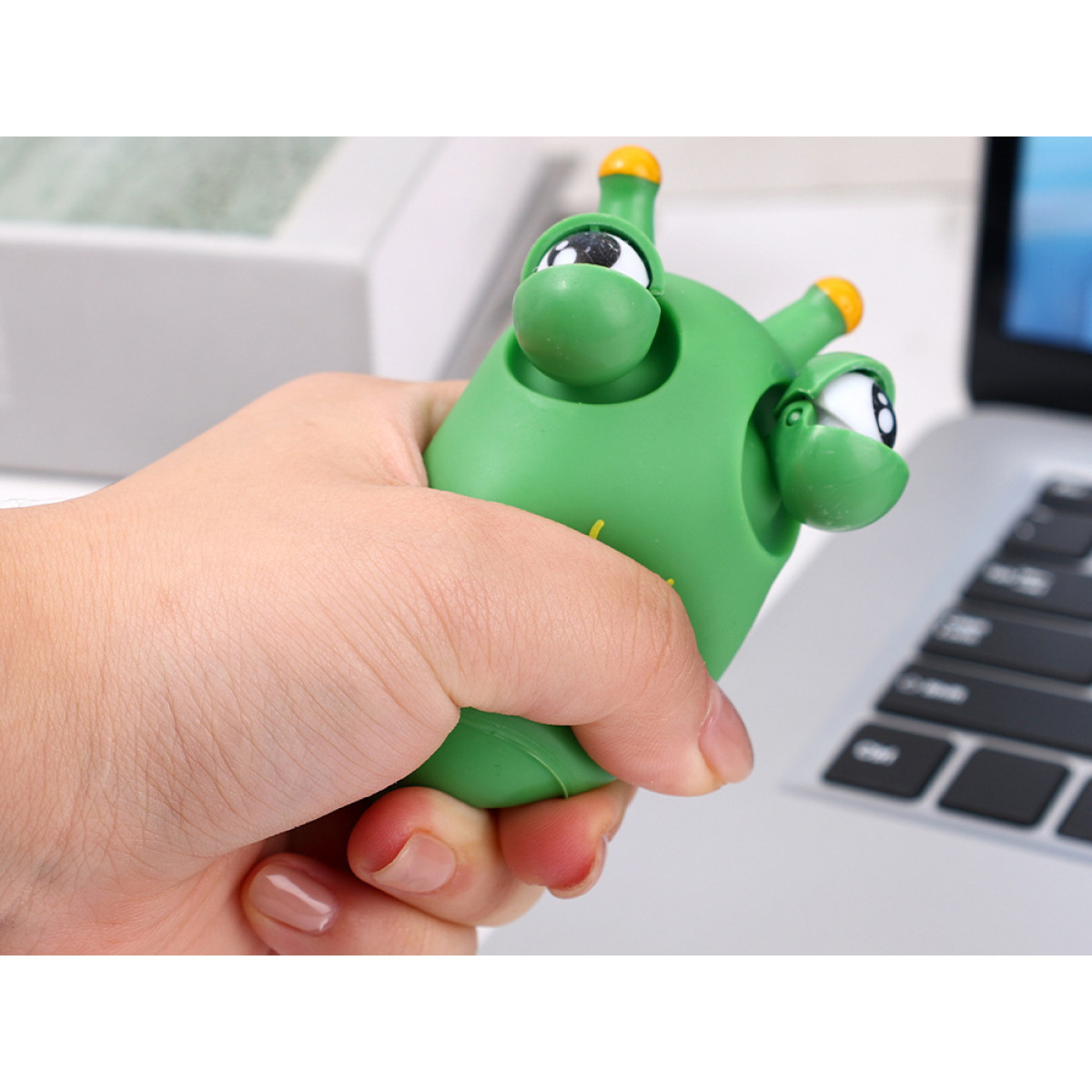 Rohelist tegelast pigistades avanevad selle silmad naljakalt. Mänguasjal ei ole välist pakendit.