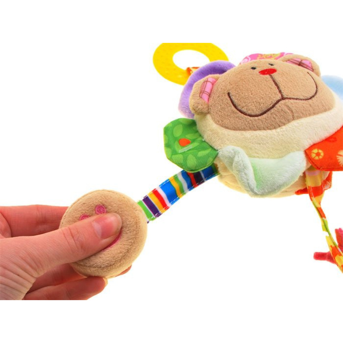 Mänguasja taga on praktiline takjapaelaga kinnitus - see võimaldab riputise hõlpsat kinnitamist voodi, autoistme, vankri või mängumati külge.