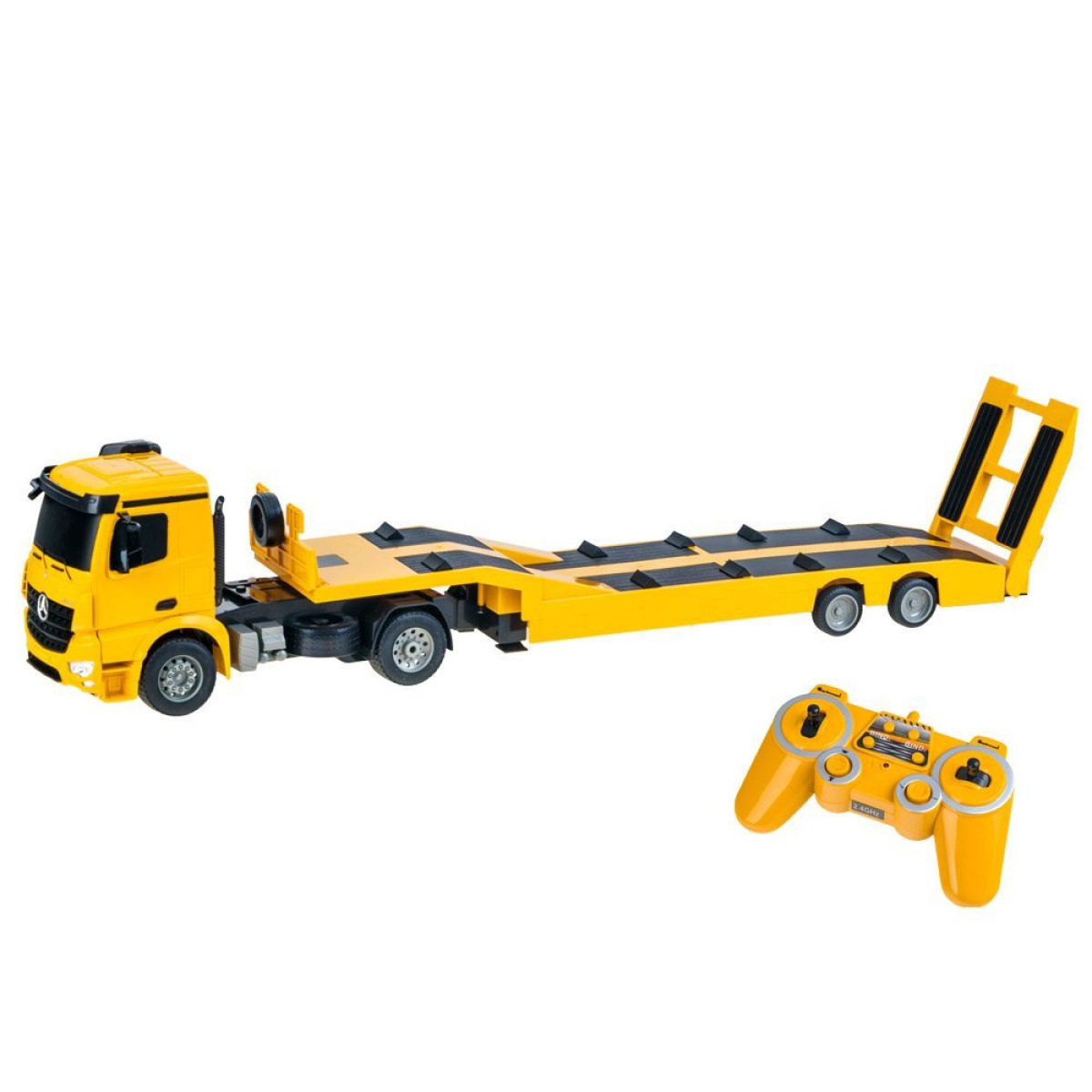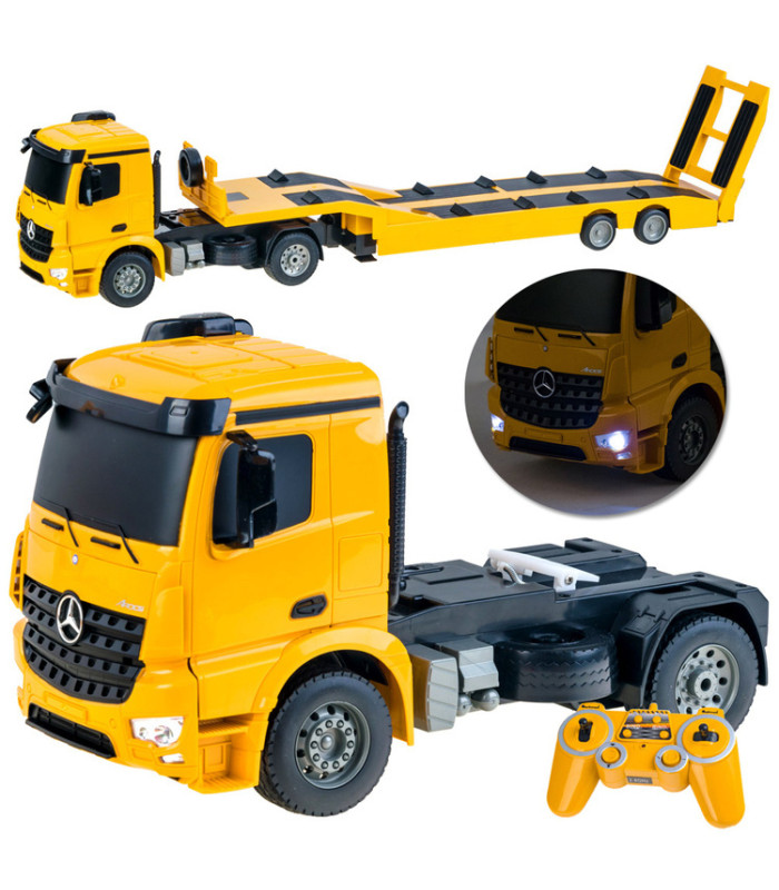 Licentseeritud Mercedes-Benz veok koos haagisega on ideaalne raskete ehitusseadmete transportimiseks. Töö ajal kostuvad realistlikud helid. Tänu 2,4 GHz sagedusel töötavale raadiokontrollerile on võimalik täielik juhtimine veoki ja haagise üle.