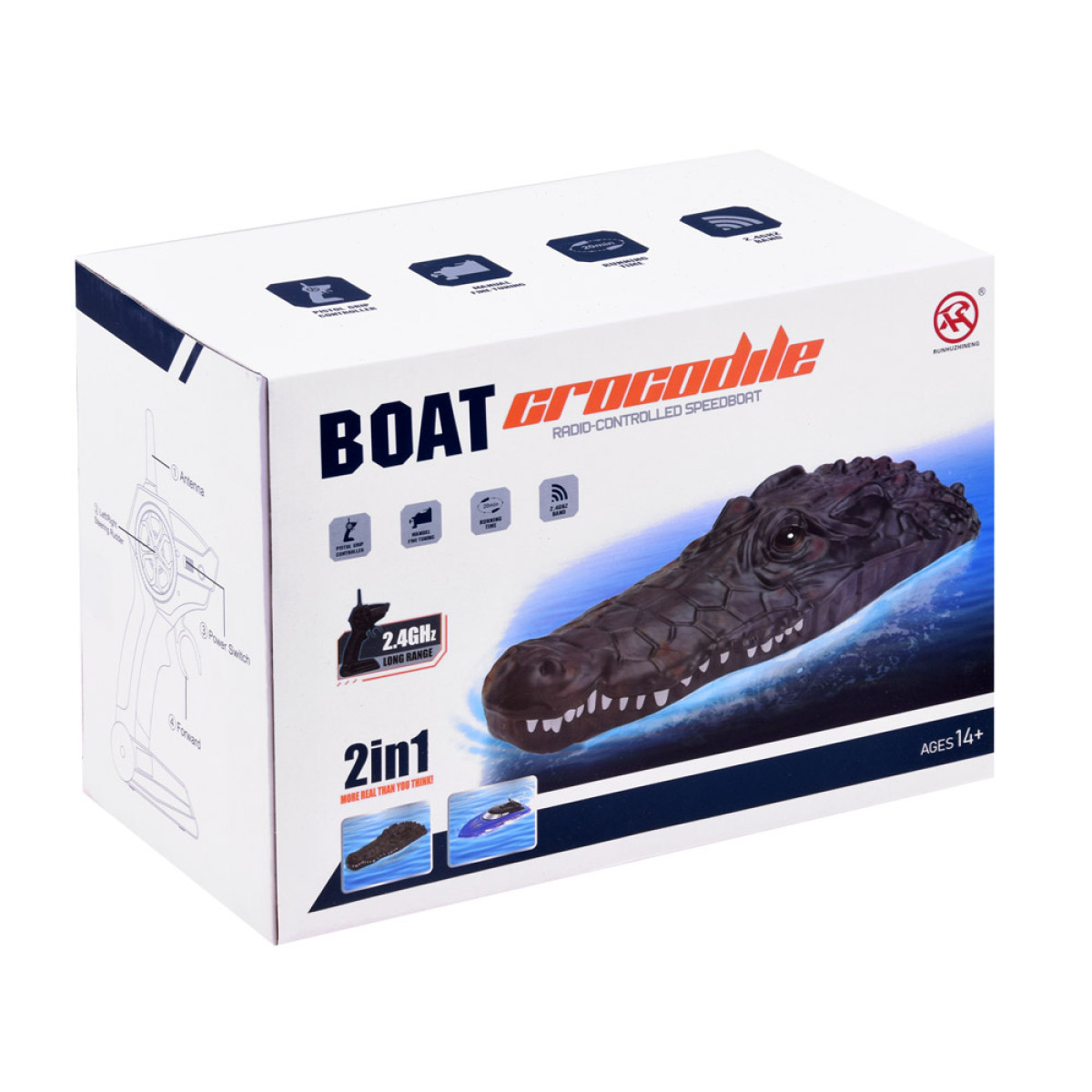 Kaugjuhitav Krokodillipaat on mootorpaad, mis tekitab vees aukartust. See 2in1 mänguasi võimaldab paadile kinnitada krokodilli pea. Krokodilli pea kuju on väga realistlikult kujundatud. Teravad ja siledad hambad, pruunid silmad ning tumeroheline soomustega nahk meenutavad tõelist krokodilli. See võib tõesti kedagi hirmutada.