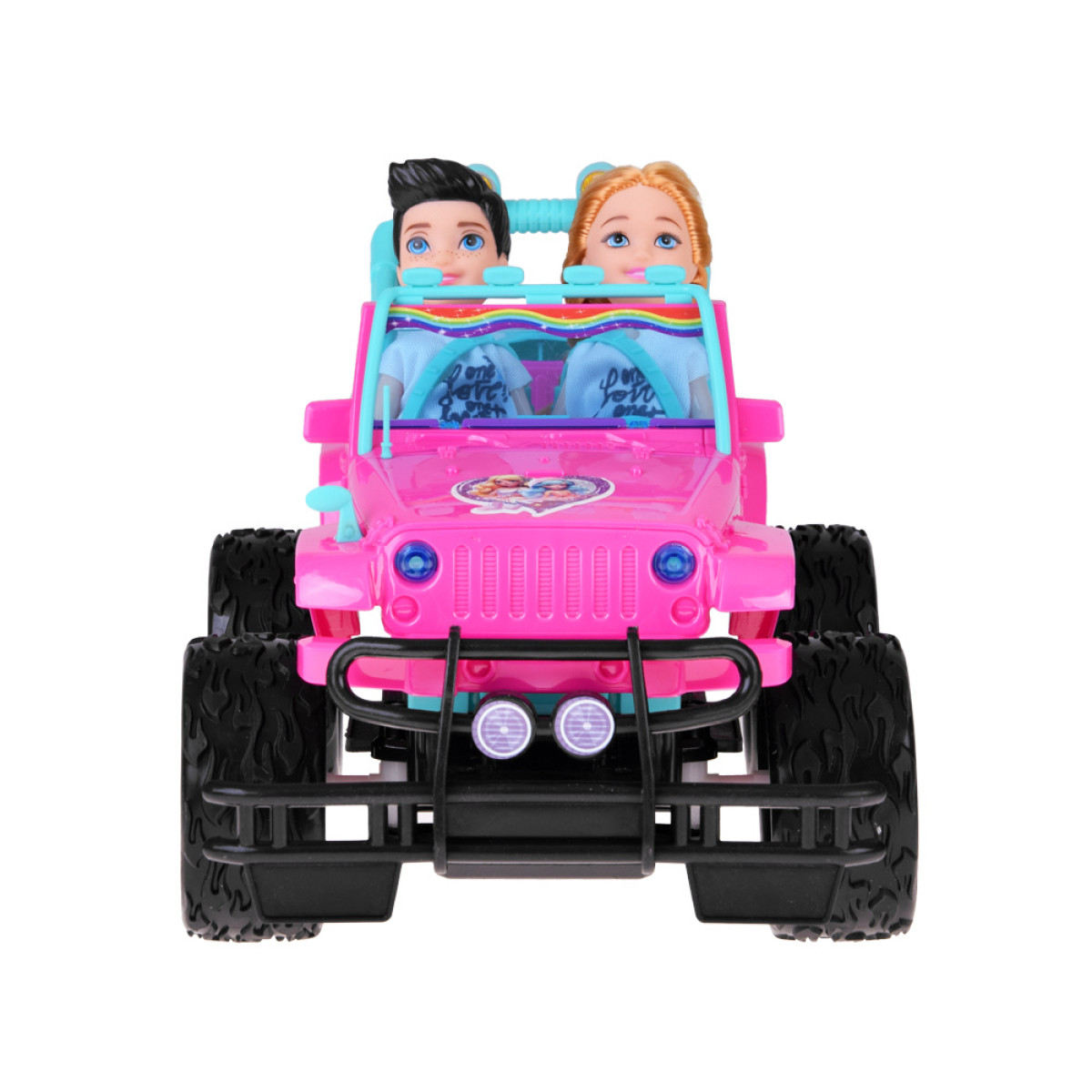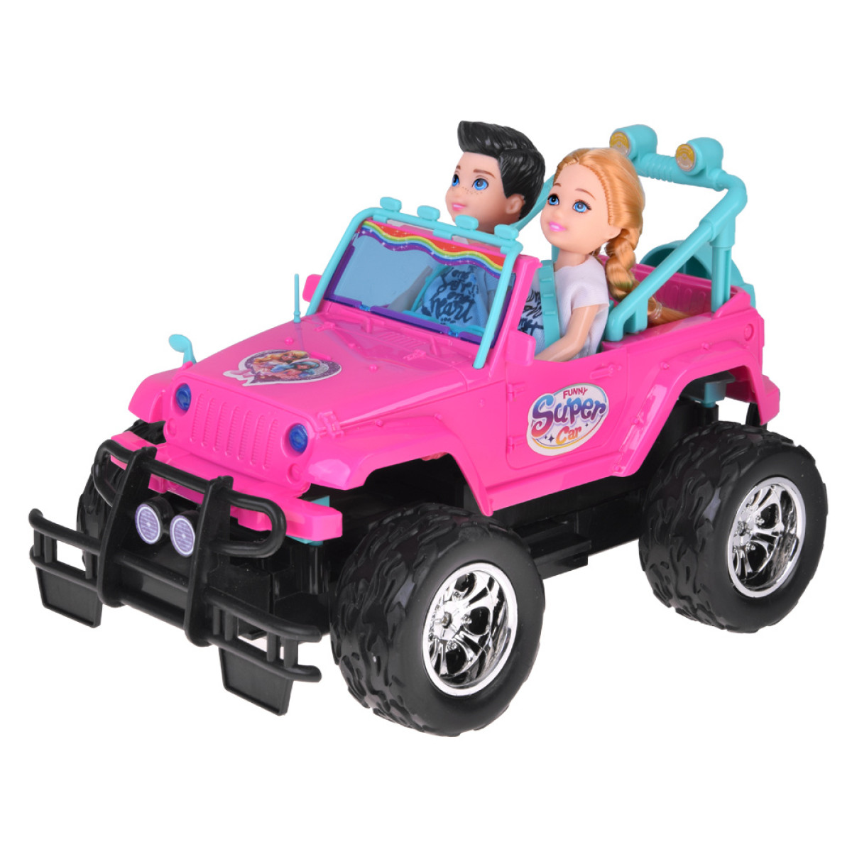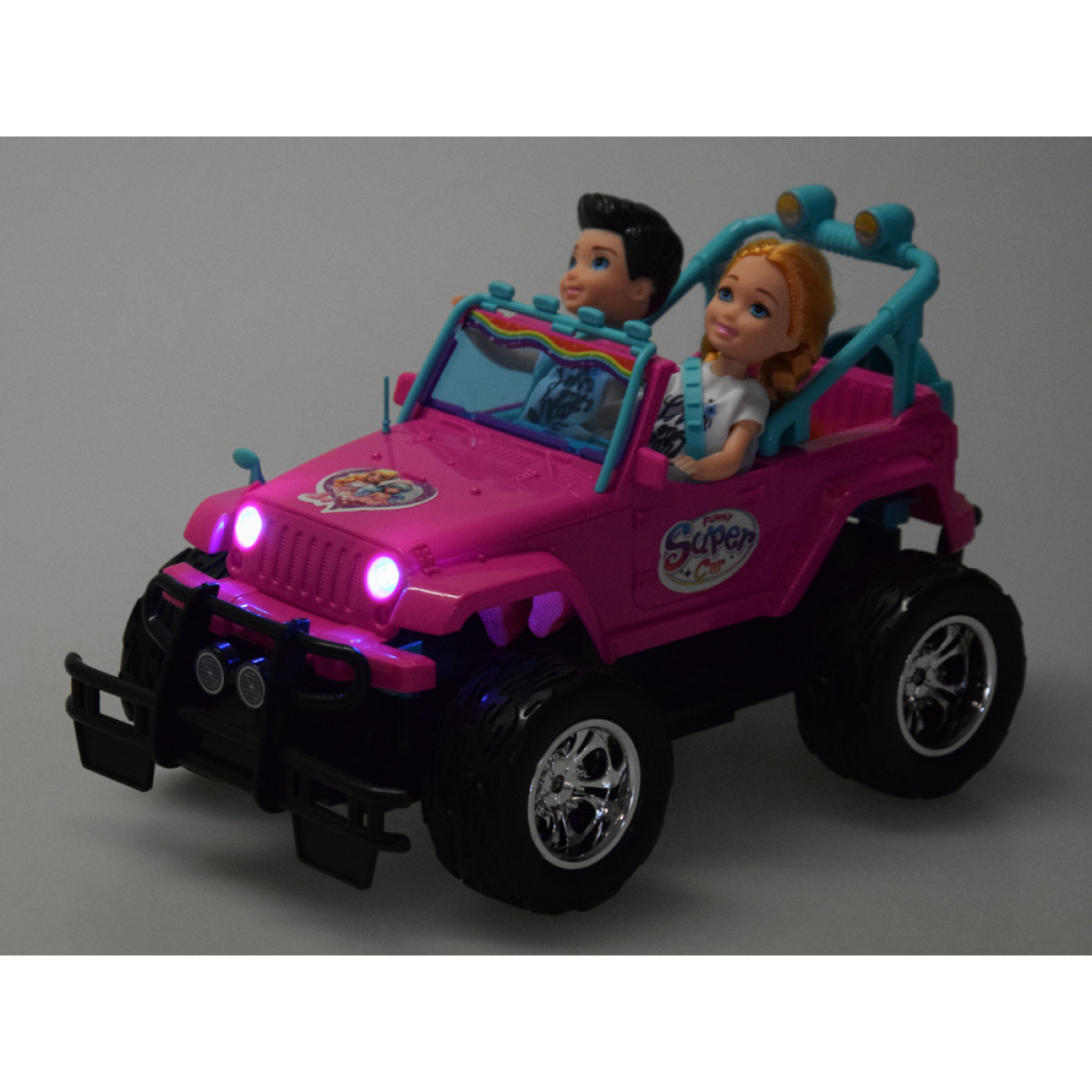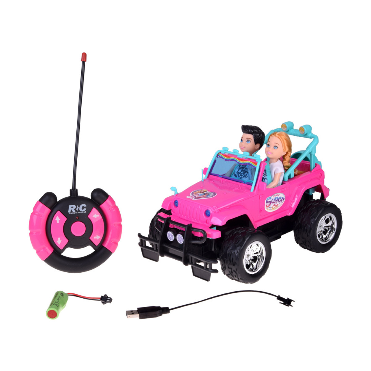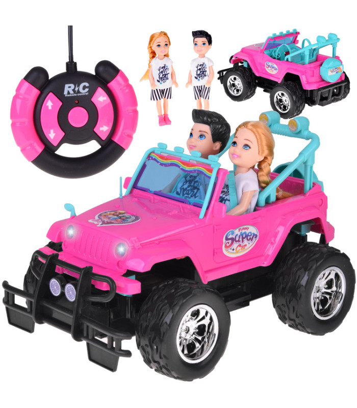 kaugjuhitav roosa maastikuauto nukkudele kahe figuuriga