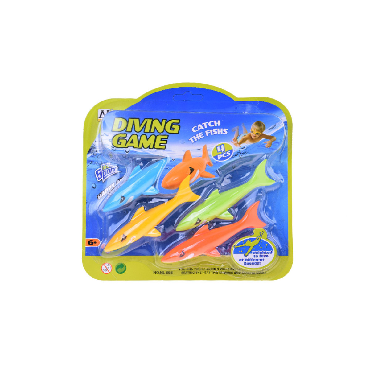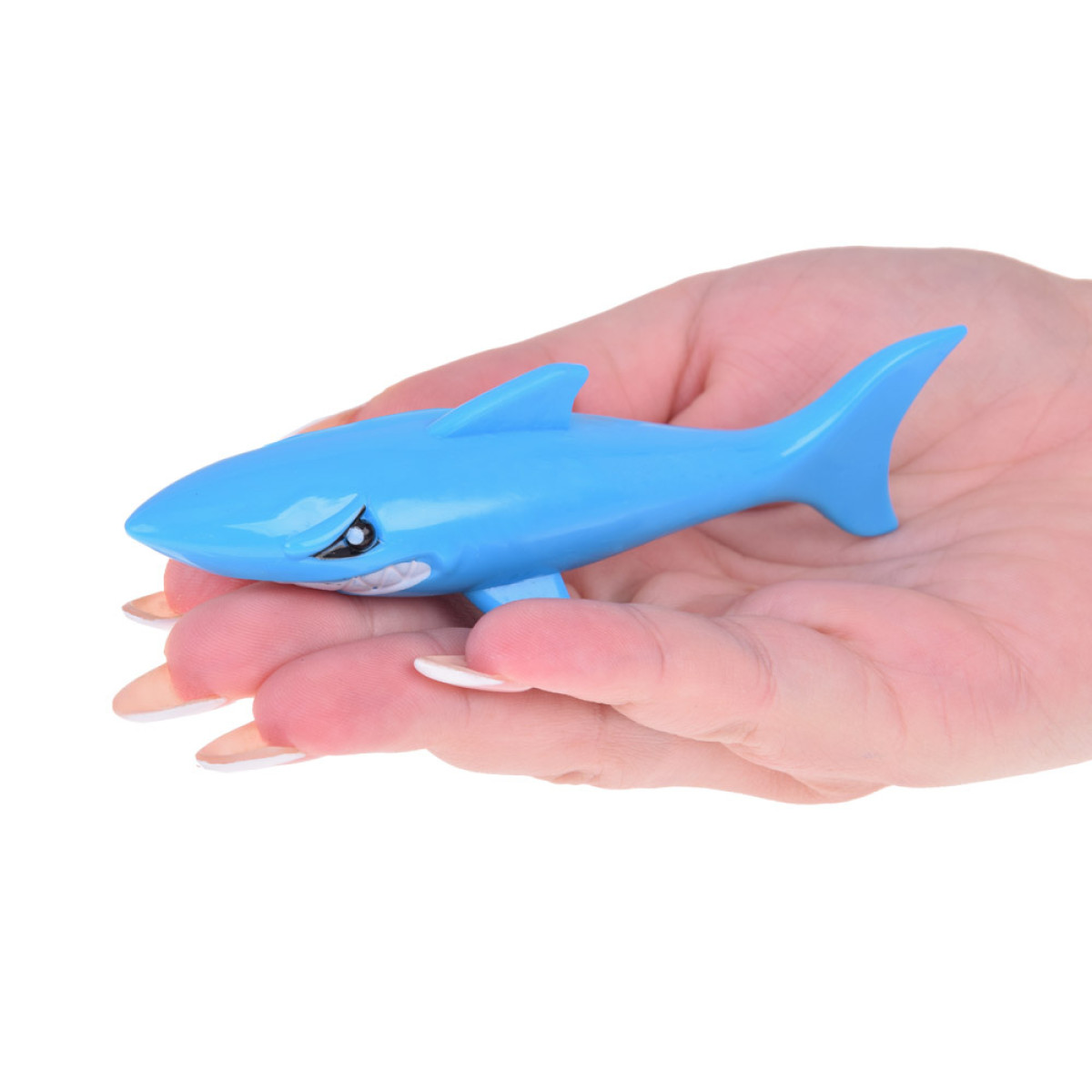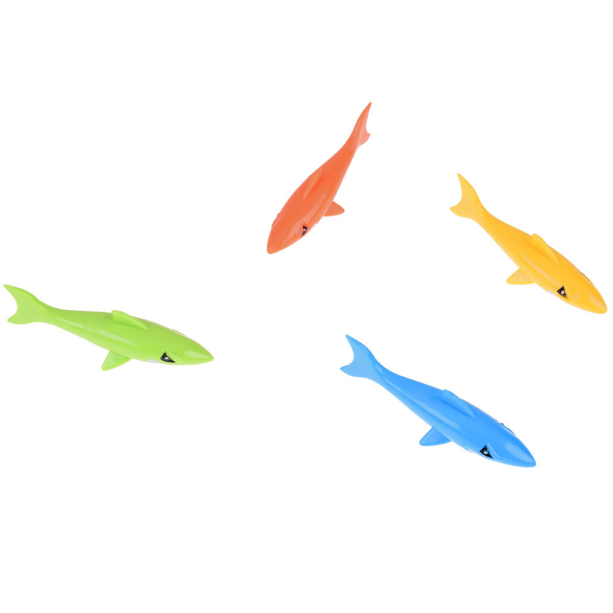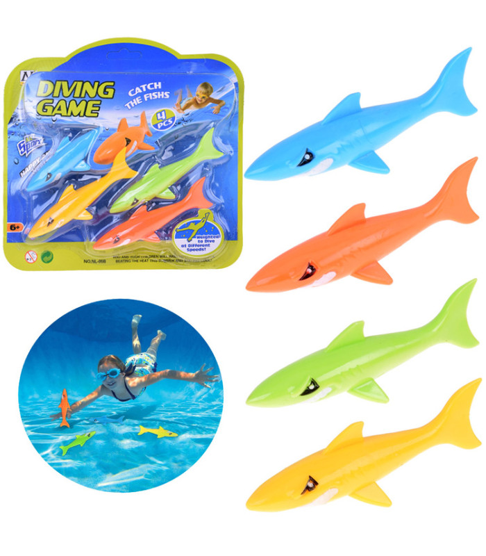 Komplektis on neli värvilist haid, umbes 12 cm pikkused ja 3 cm laiad, valmistatud pehmest uppuvast kummist. Mänguasjad on meeldivad puudutamisel, teravate servadeta ja täiesti ohutud vees mängimiseks – nii basseinis, tiigis kui ka vannis.