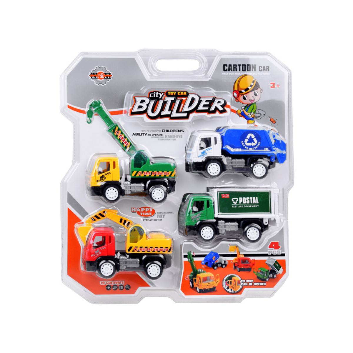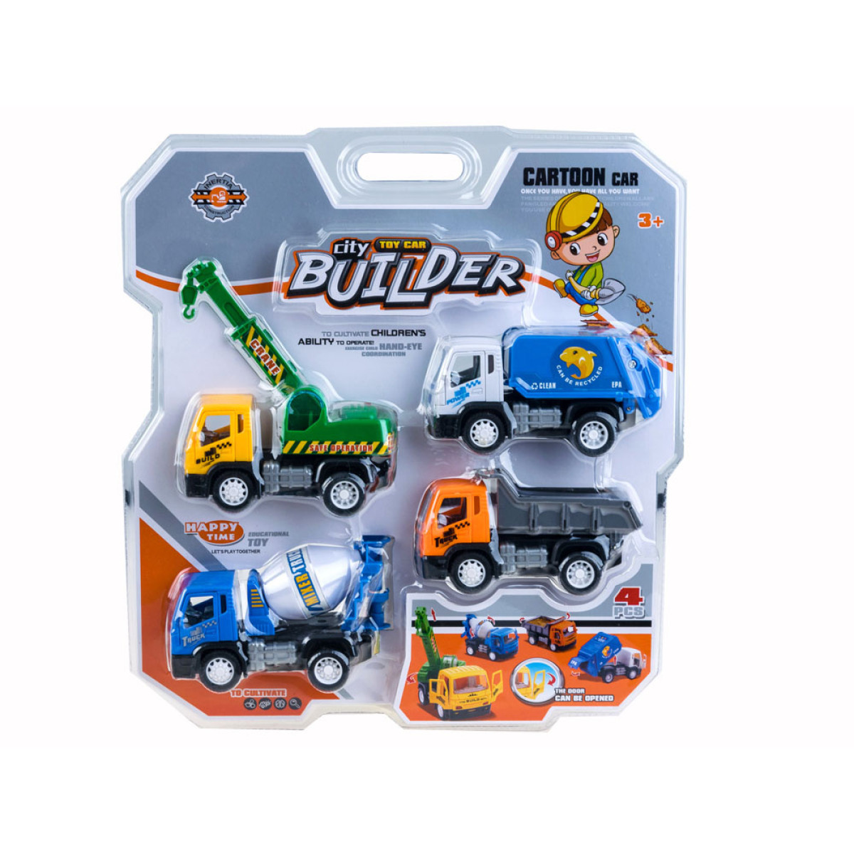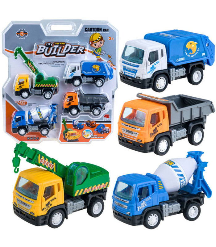 Plastikust ehitusautode komplekt avanevate ustega, sobib iga ehitusplatsi jaoks. Komplekt on valmistatud väga kindlalt ja efektselt, erksates ja ilusates värvides, ohutu väikestele lastele. Selline sõidukite komplekt rahuldab iga väikest ehitussõidukite armastajat. Tänu väikestele mõõtmetele on sõidukid suurepärased väikeste laste kätele. Nad on väga käepärased, mahuvad igale poole ja neid saab kaasa võtta jalutuskäigule või lasteaeda. Komplekt sisaldab nelja hoolikalt valmistatud sõidukit, mis rahuldavad iga väikest inseneri. Mänguasi liikuvate osadega (kallur, avanevad uksed), auto on varustatud Friction power mehhanismiga, mis tähendab, et see kiireneb mänguasja liigutamisel siledal pinnal.