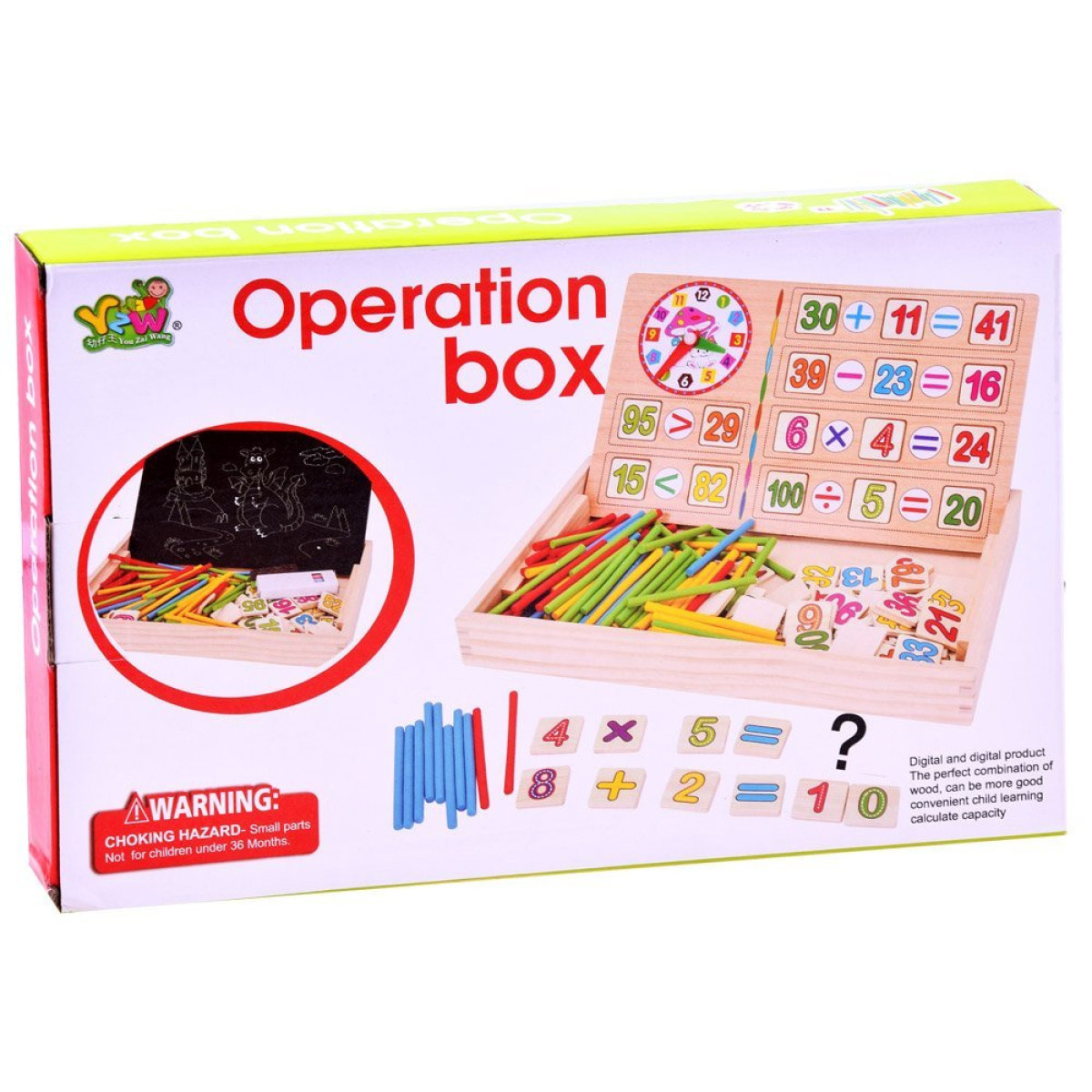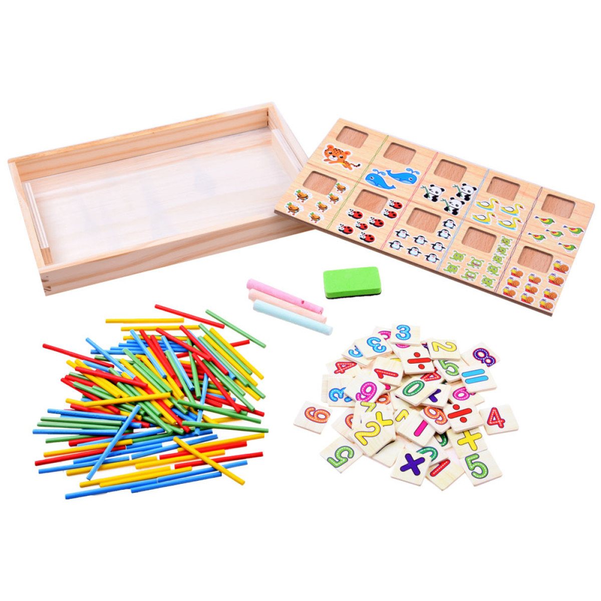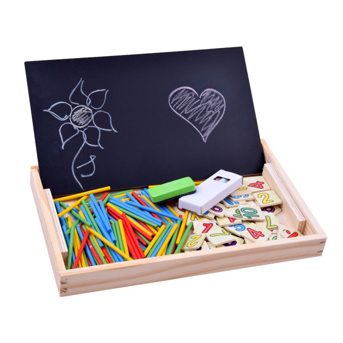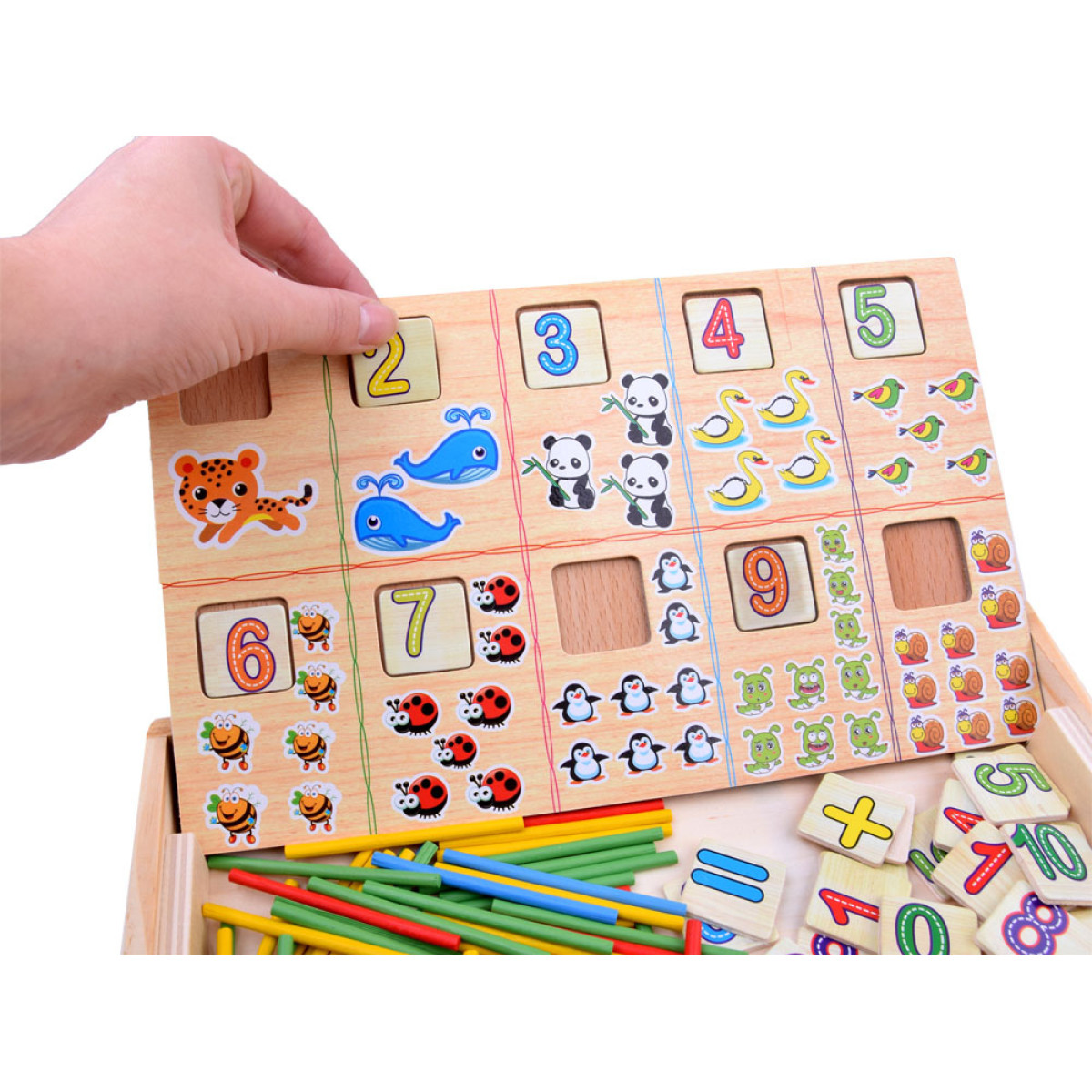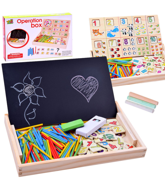 Hariduslik komplekt matemaatika õppimiseks sobib suurepäraselt esimesteks sammudeks matemaatikas. Komplekt on täielikult valmistatud puidust ja pakitud suletavasse karpi. Üks libiseva kaane pool on mõeldud kriidiga kirjutamiseks, teine pool on piltidega loomadest ja numbritest.