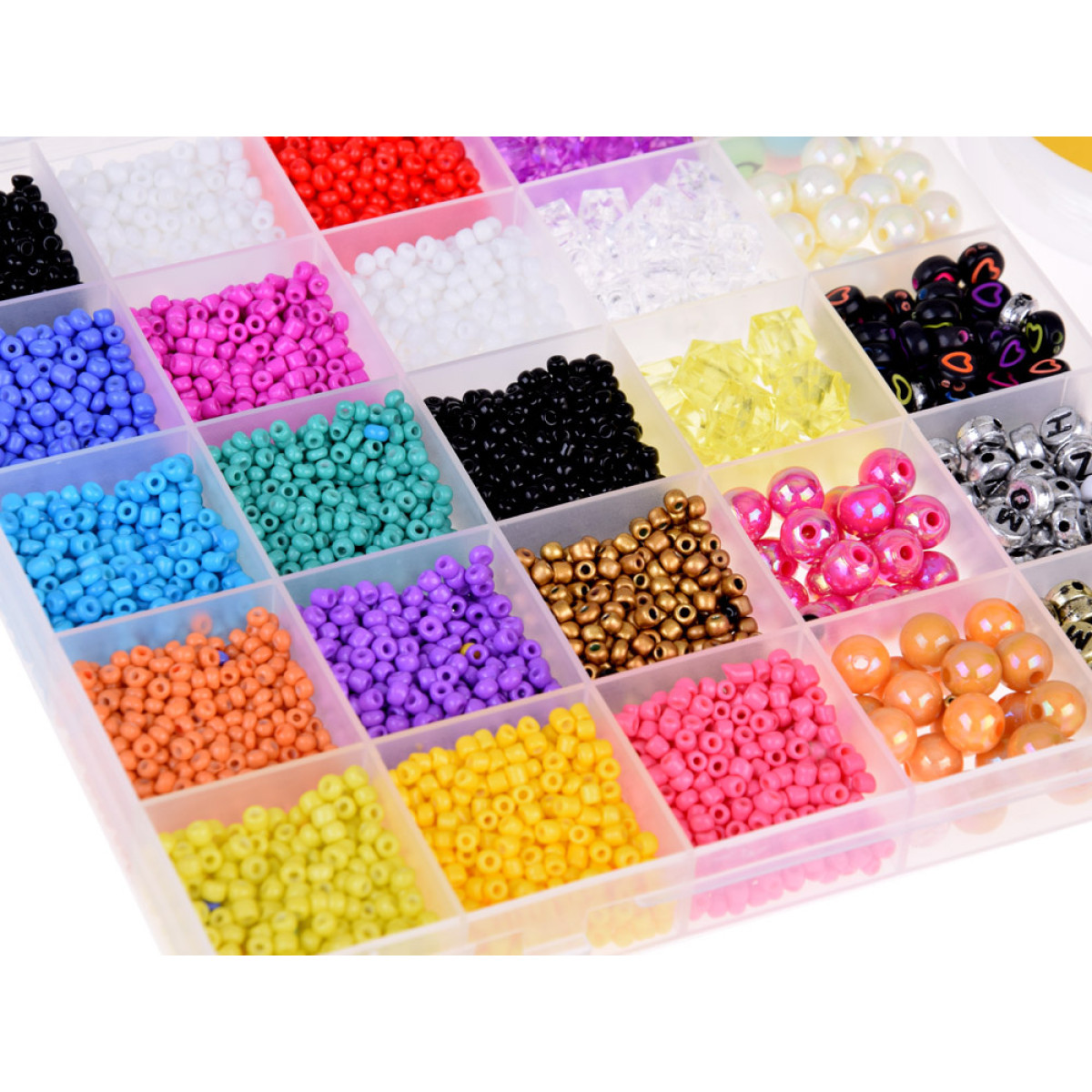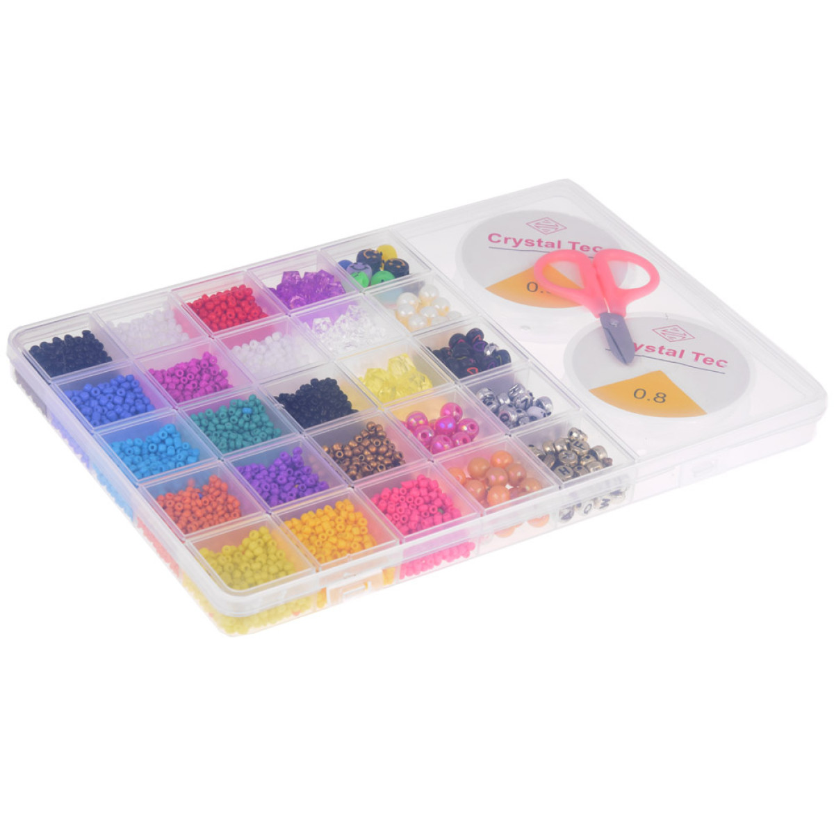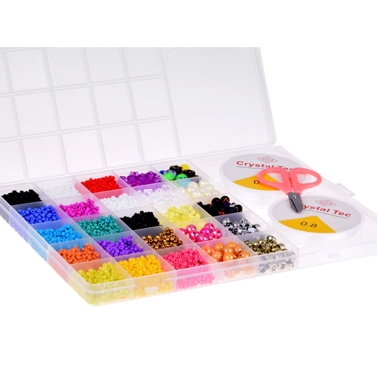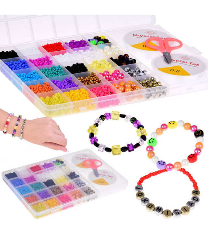 Meie komplekt sisaldab 22 erinevat värvi helmeid, sealhulgas sinise, türkiisi, lilla, roosa, rohelise, valge toone ning tähehelmeid. Need on paigutatud läbipaistvasse, piklikku pakendisse, mis meenutab kohvrit ja on jagatud sektsioonideks, et helmed ei seguneks. Komplekt sisaldab ka 2 rulli läbipaistvat nööri ja kääre vajalike ehete loomiseks, et saaksid kohe tööle asuda.