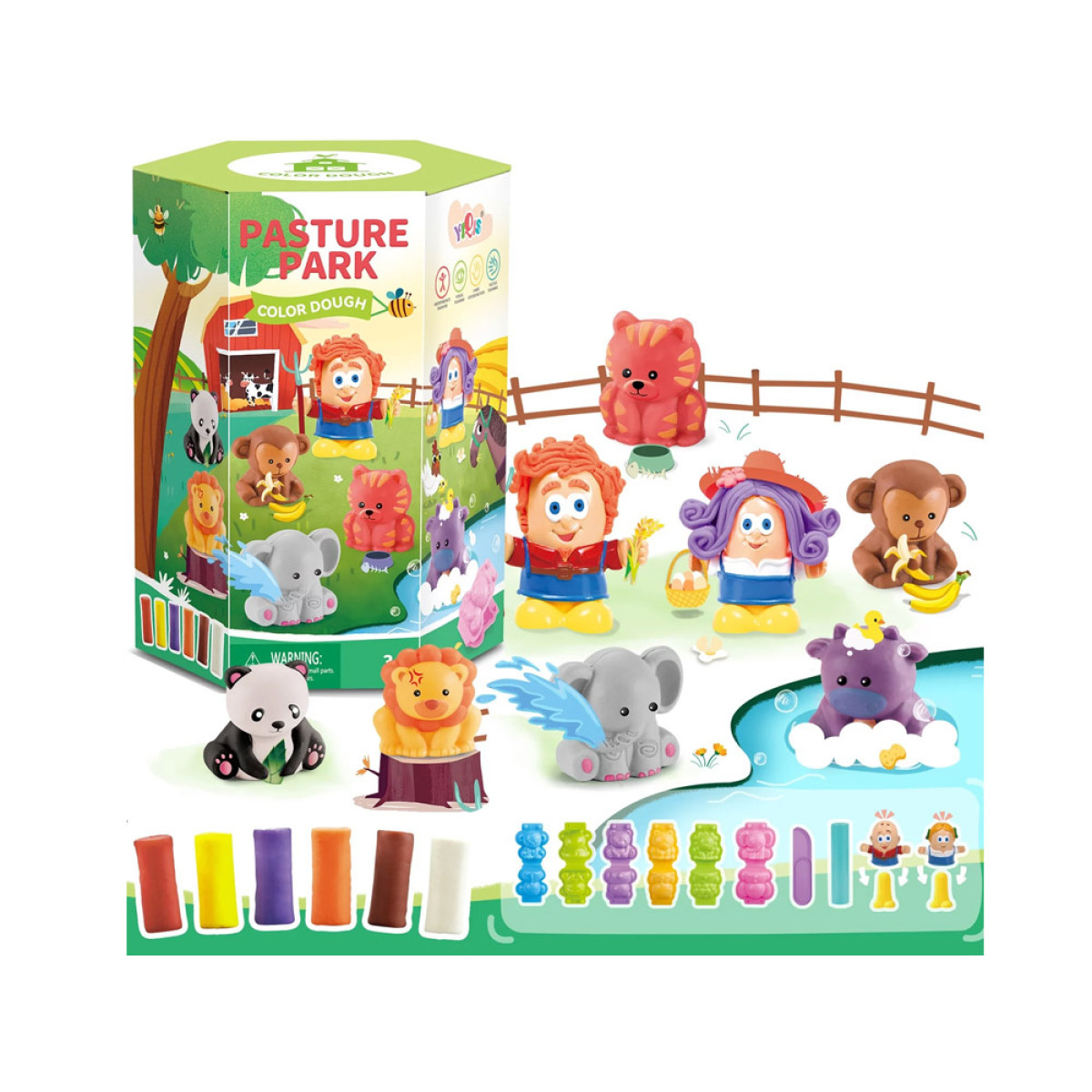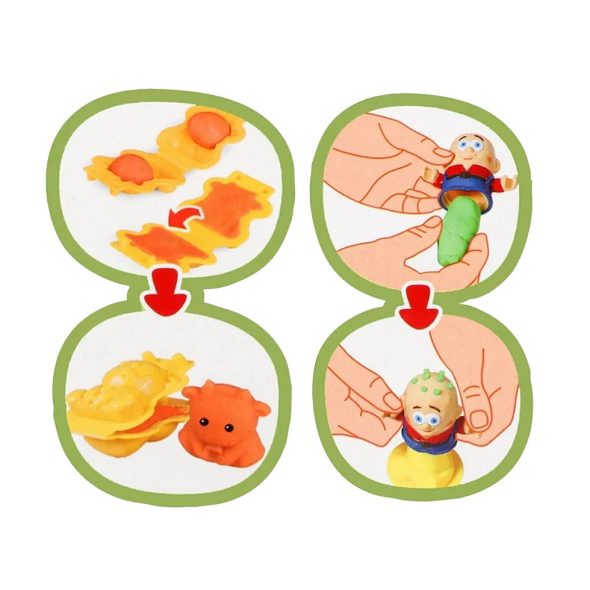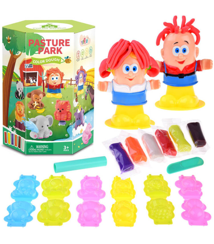 Suurepärane komplekt igale lapsele, kes armastab kunstitöid. Plastiliini saab venitada, mudida, rullida, harjutades käte osavust. Mäng arendab lapse kujutlusvõimet ja keskendumisvõimet ning õpetab eristama värve ja kujundeid. Komplekt võimaldab luua mini-loomaaia, piisab plastiliini paigutamisest valitud vormi ja selle sulgemisest, et saada kolmemõõtmeline figuur. Loomade eest hoolitsevad hoidjad, kellele saame luua erinevat värvi ja pikkusega soenguid. Selleks tuleb panna väike osa plastiliini valitud värviga figuuri sisse ja seejärel suruda jalaga elemendile.