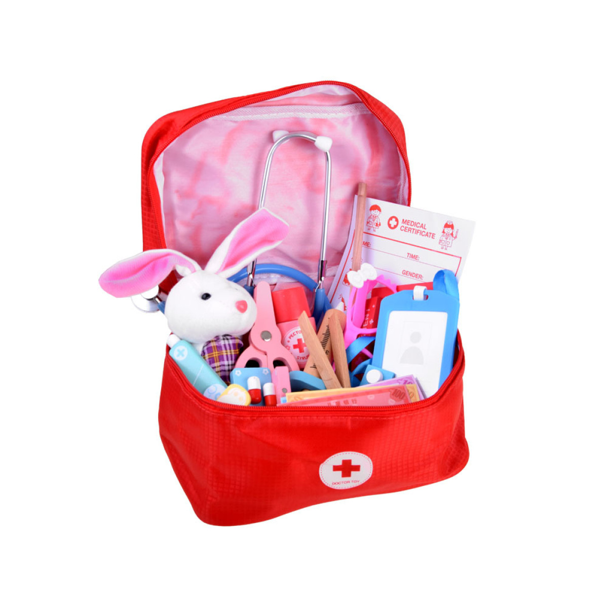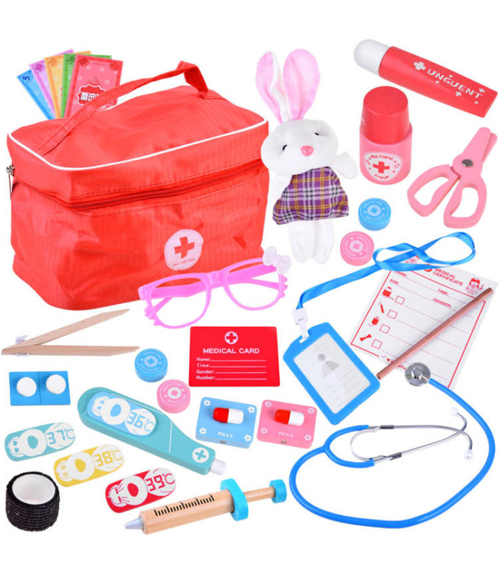 Väike arsti mängukomplekt puidust tarvikutega sobib suurepäraselt igasugustes meditsiinilistes hädaolukordades mängimiseks. Komplekti kuuluvad kõik vajalikud vahendid edukaks mänguks. Värvilised meditsiinitarvikud on valmistatud puidust, arsti ID-kaart on plastist, samas kui komplektis olev stetoskoop on valmistatud metallist ja kummist. Mängustetoskoop töötab sarnaselt päris seadmele, võimaldades kuulata oma või uuritava isiku südamelööke. Komplekt sisaldab armsat pehmet jänkut julge patsiendi jaoks. Kõik on pakitud mugavasse punasesse esmaabikotti koos käepidemega.