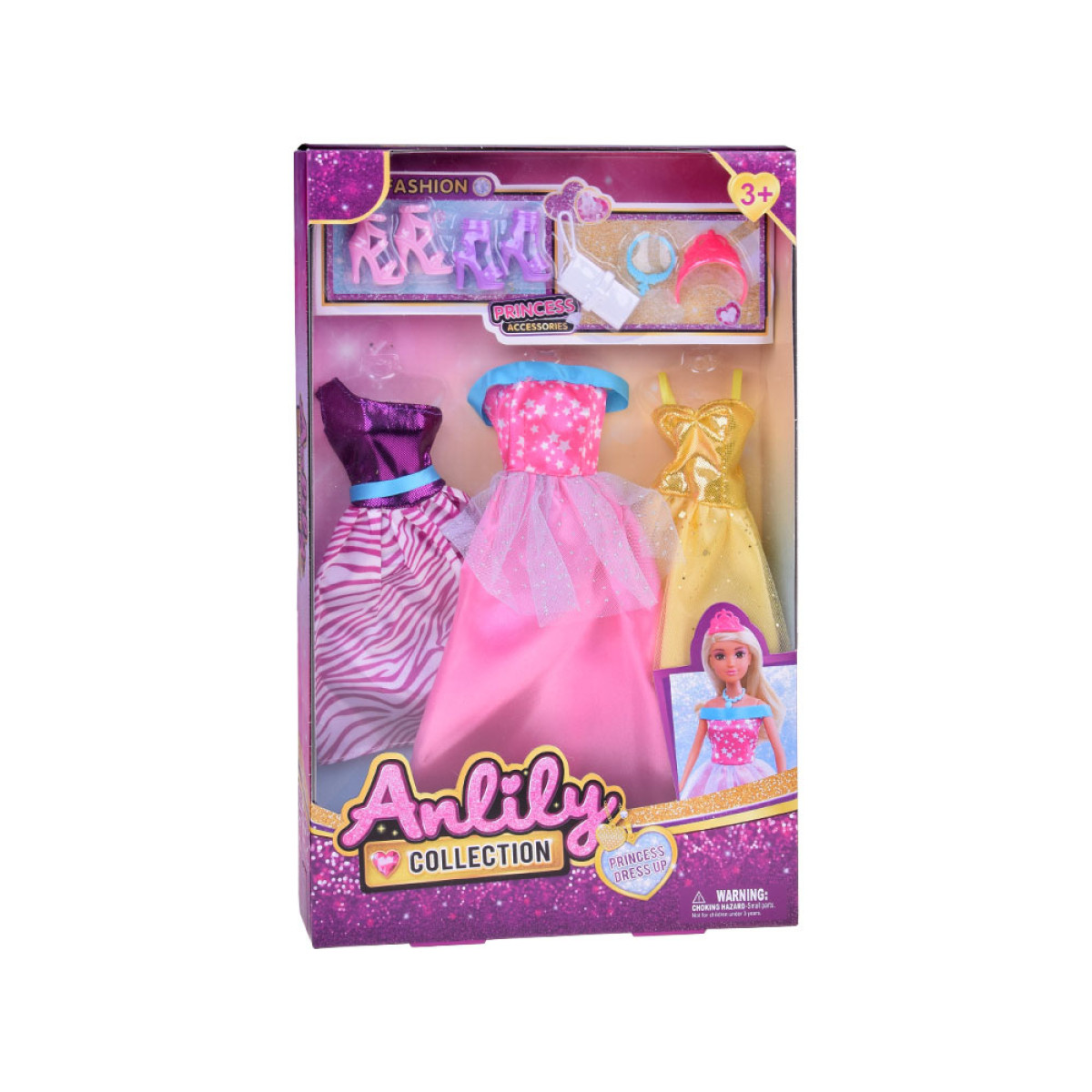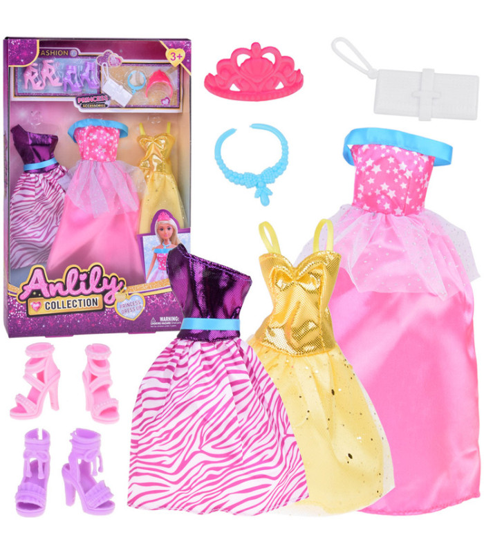 Komplektis on kolm erinevat kleiti – igaühel ainulaadne lõige ja värvilahendus, mis võimaldavad luua mitmekesiseid stiile igaks sündmuseks. Kaks paari elegantseid kontsakingi lisavad šikki ja klassi, ning täiendavad komplekti: efektne käekott, sinine kaelakee ja õrn kroon – ideaalne igale väikesele printsessile.