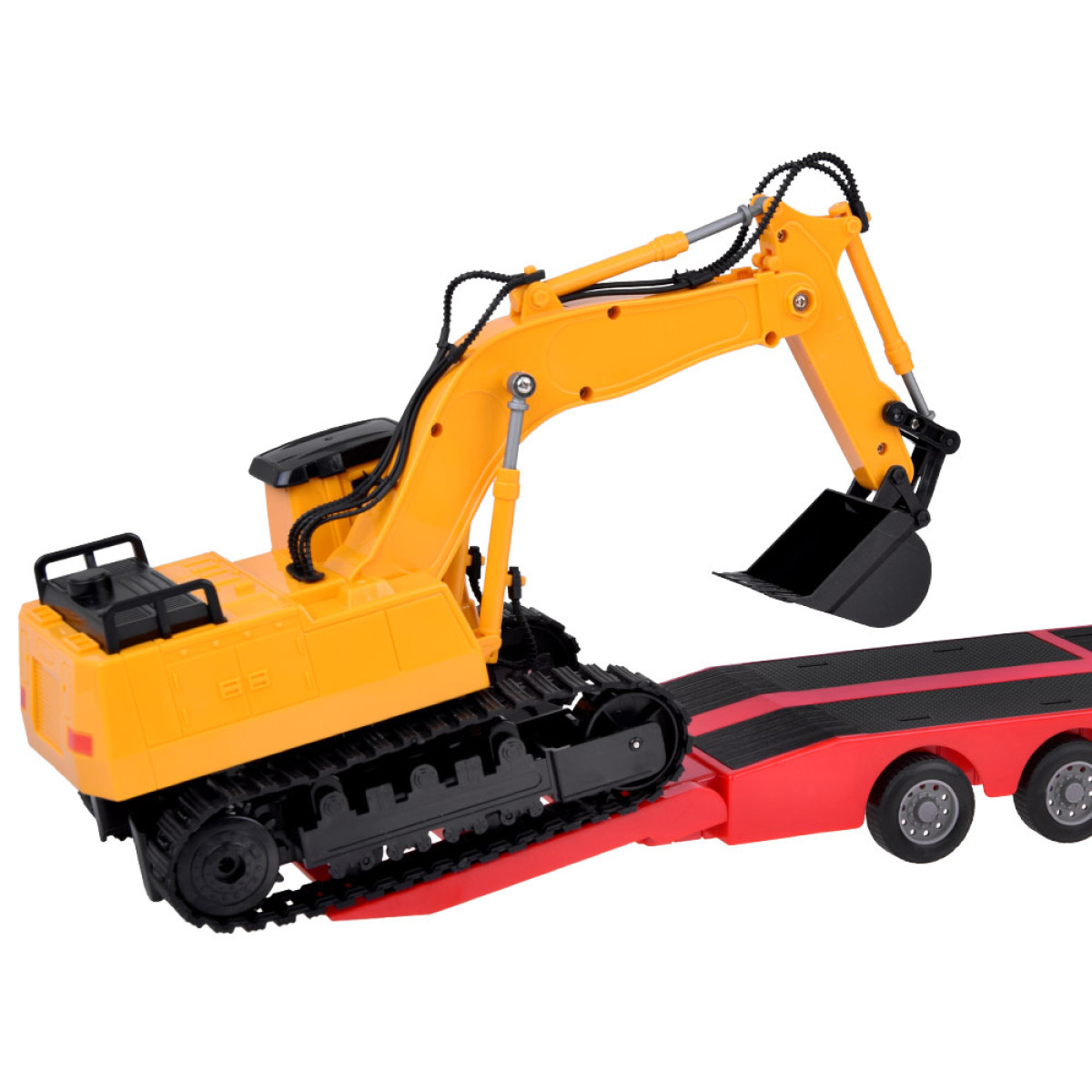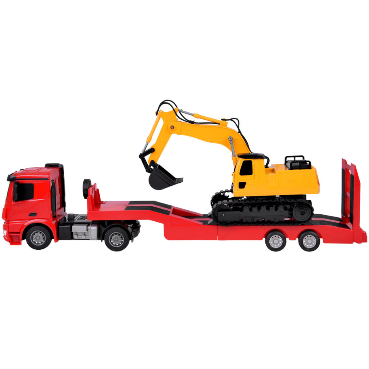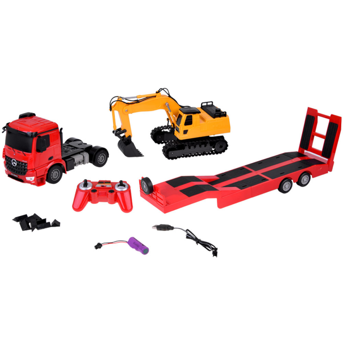 See puldiga juhitav Mercedes veok koos haagise ja ekskavaatoriga on ideaalne komplekt väikesele autojuhile. Realistlikud valgustusefektid (eesmised tuled vilguvad valgeks) ja heliefektid (mänguasja käivitamine, mootori töö, sõidava sõiduki heli, suunatulede heli, signaal) tagavad suurepärase mängukogemuse.