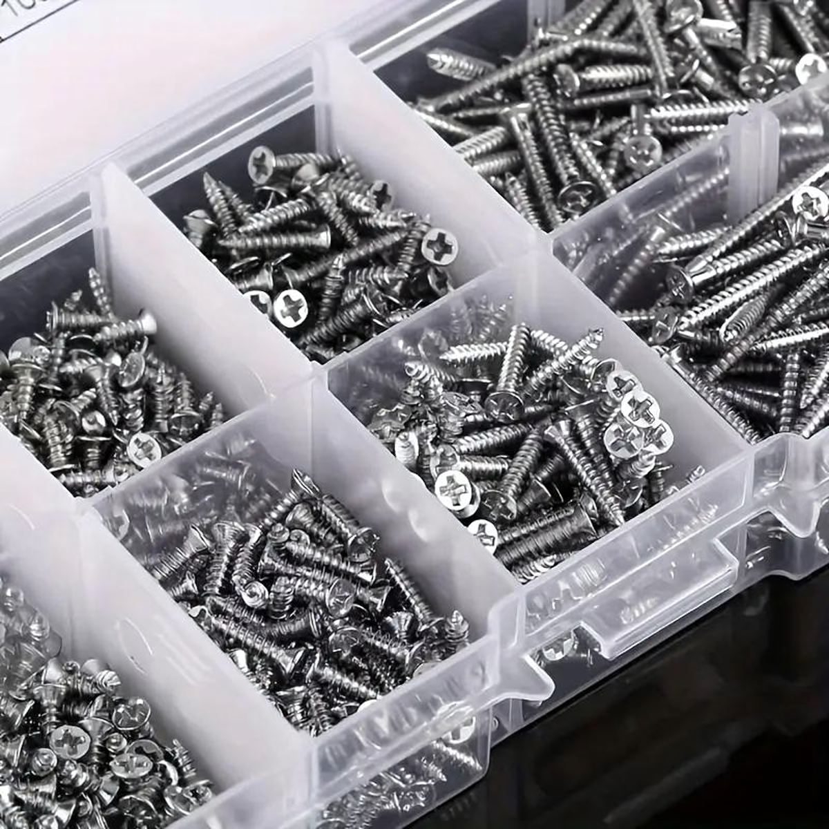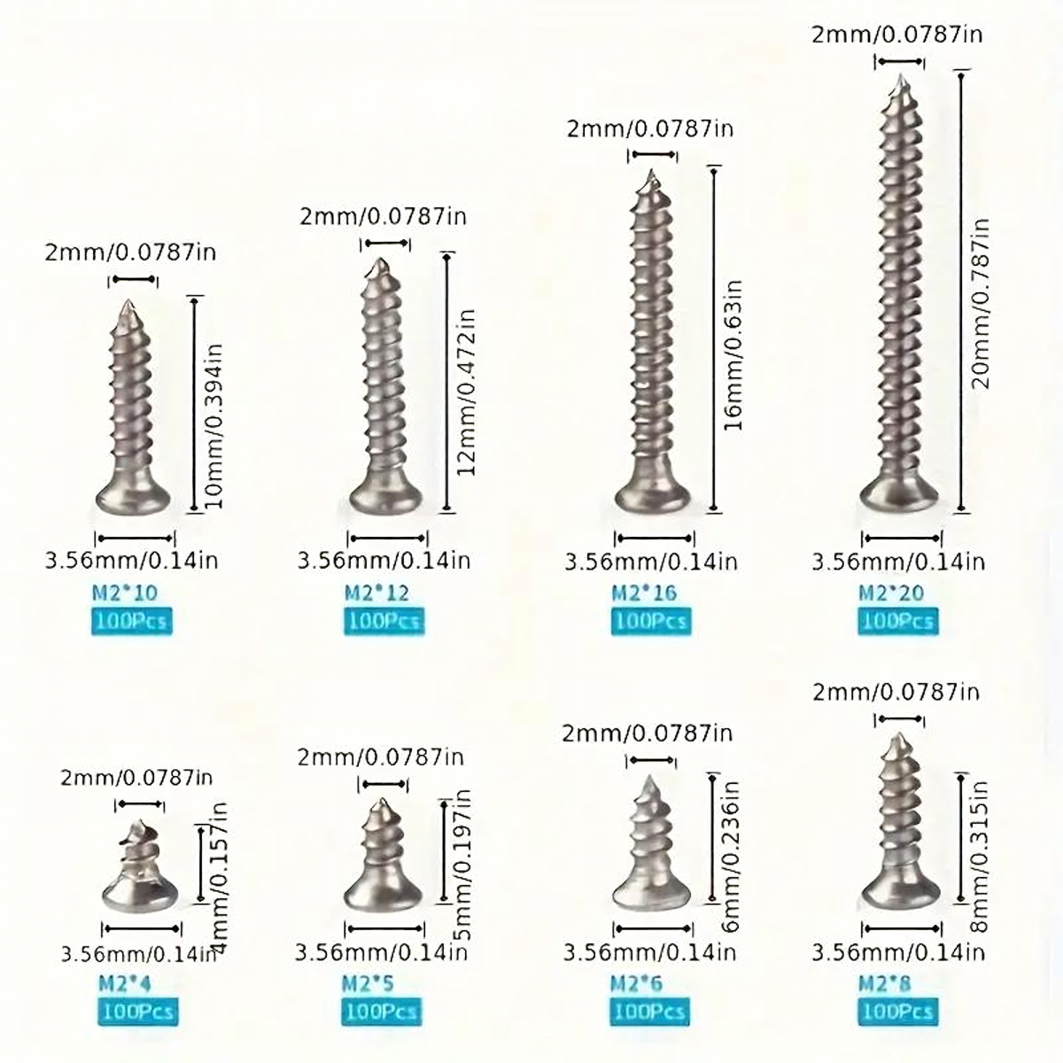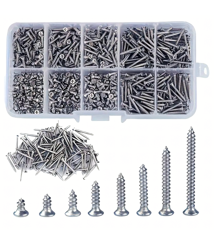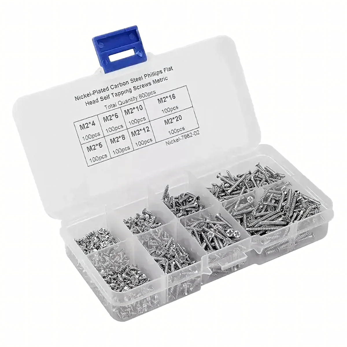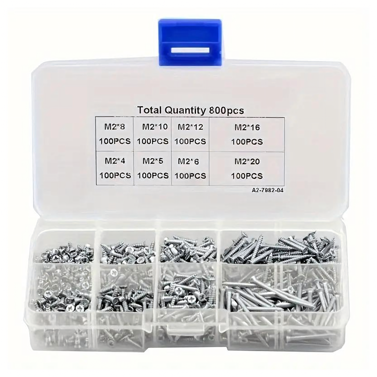 800 universaalset M2 kruvi komplekt valmistatud nikeldatud süsinikterasest, saadaval 8 suuruses (4-20 mm). Ideaalne puidule, elektroonikale, plastile ja metallile. Pakitud praktilisse organiseerimiskasti mugavuse ja korra tagamiseks.